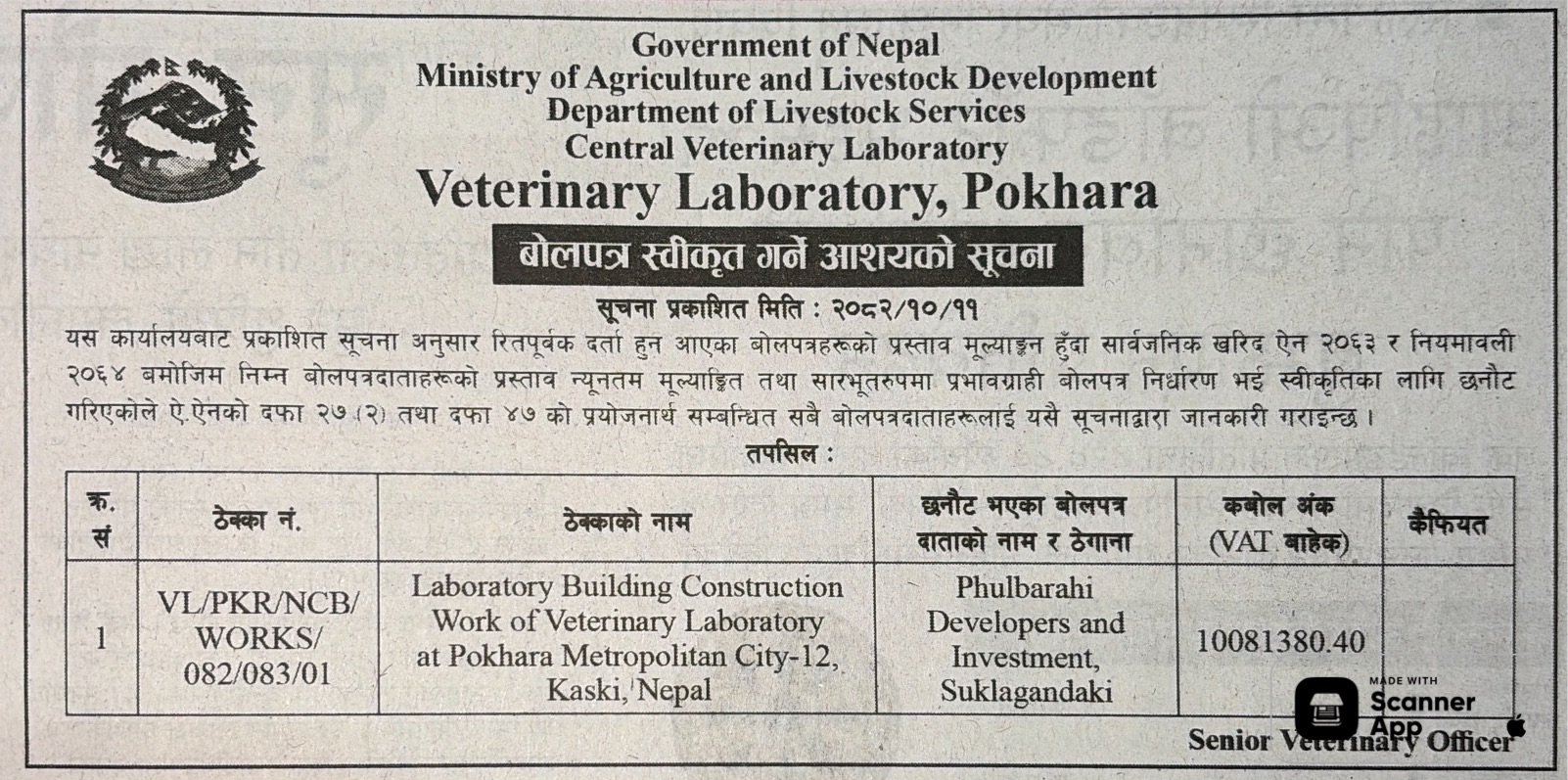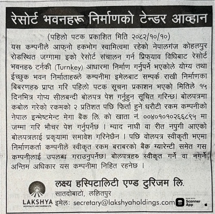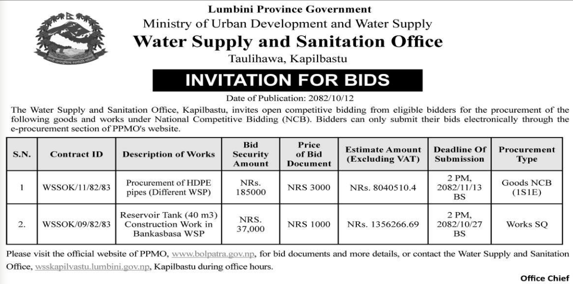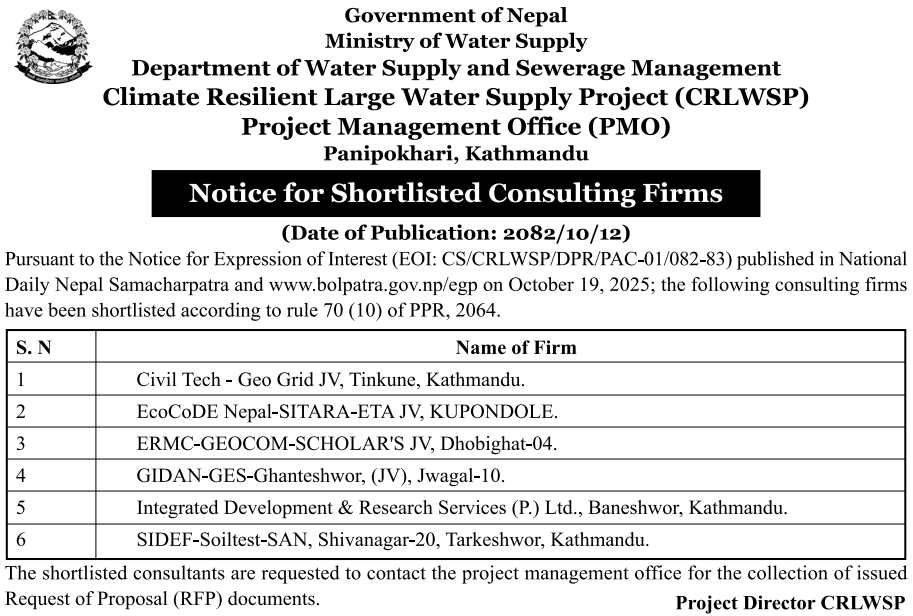 | 113 | Phalebas Municipality Office, Gandaki Province, PARBAT; | Nuwar Kaure Basti Samrakshan | 25/01/2026 | PPMO | 24/02/2026 | Click Here | |
