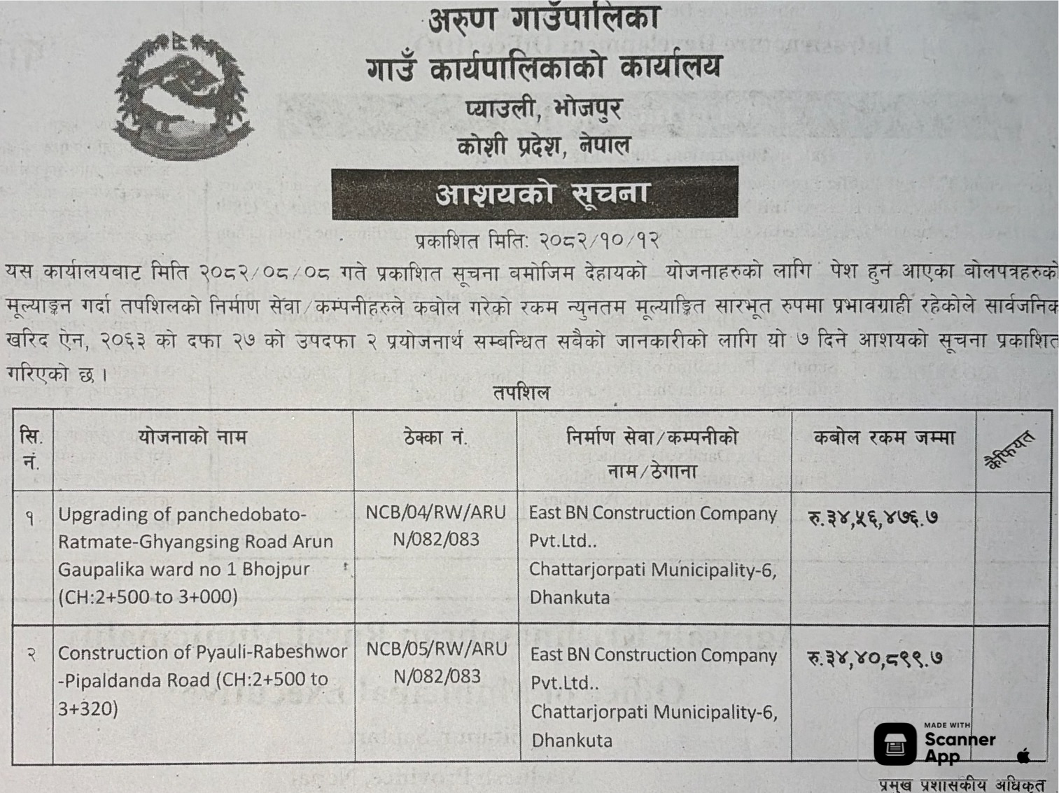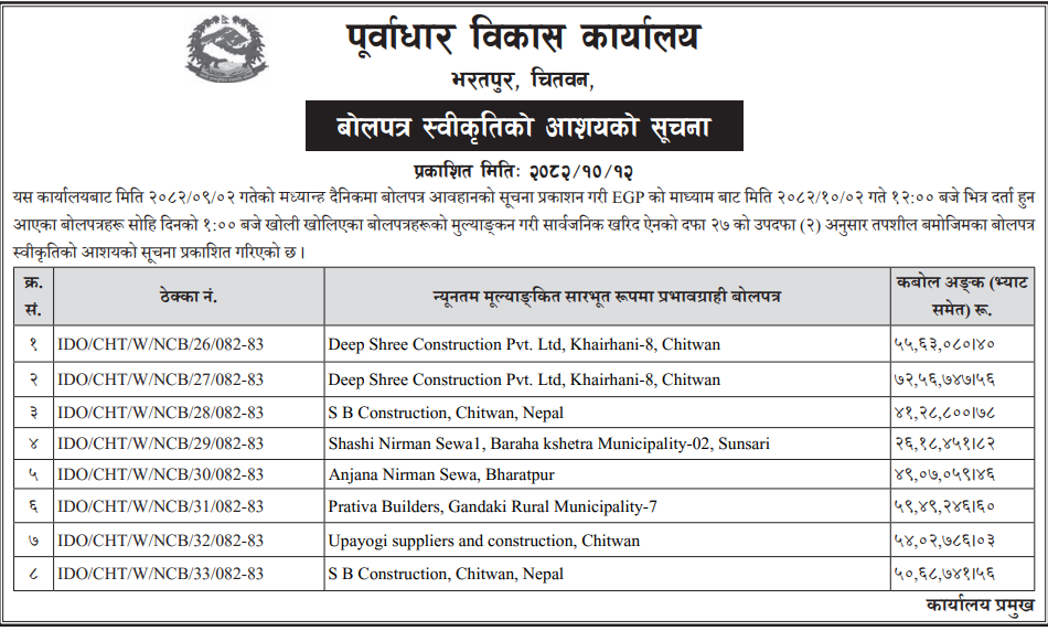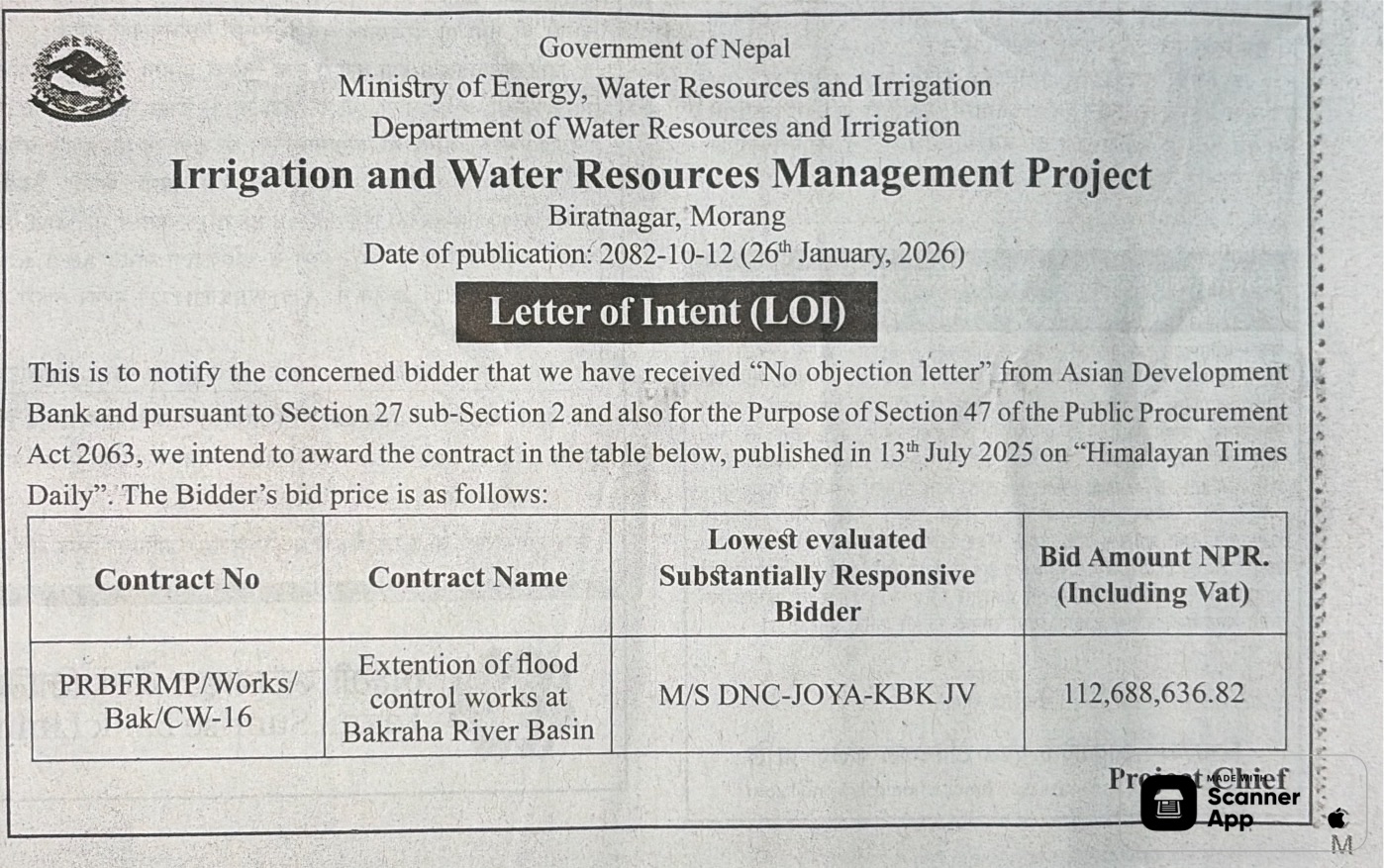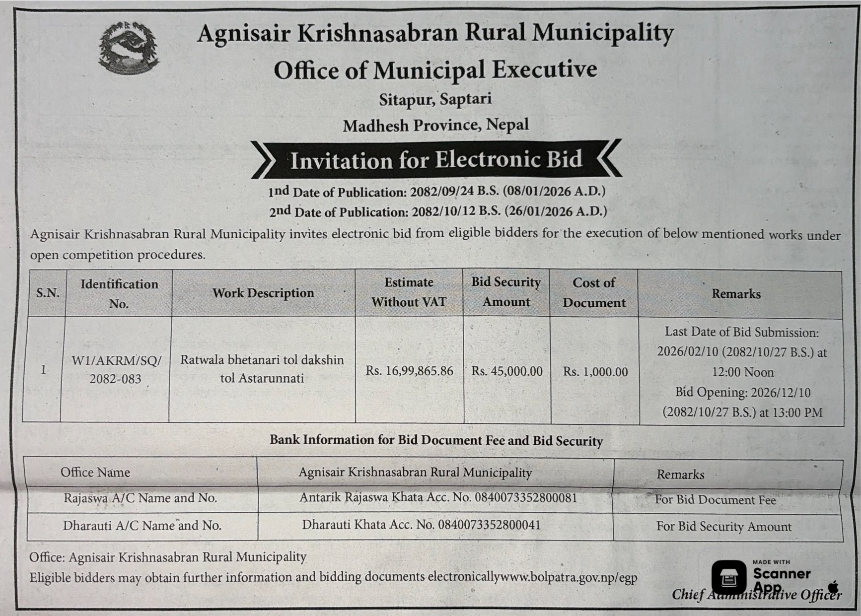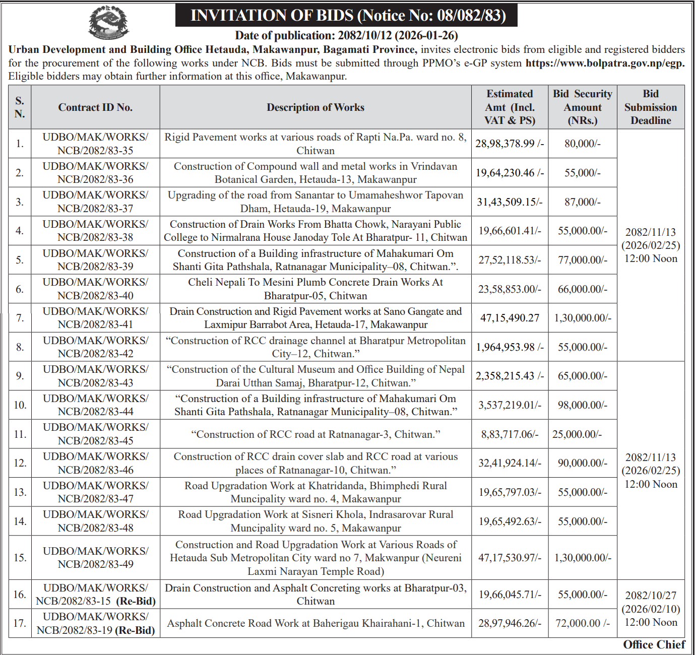 | 37 | Infrastructure Development Office (IDO), Siraha | Siraha Naraha Ga Pa 3 Chandraayodhyapur Siraha link Road dekhi Ram Narayan Yadav ko Ghar dekhi Sonphi Bans hudai Upkar Mil Kamat samma Sadak ra dubai tarpha Nala nirman | 25/01/2026 | PPMO | 25/02/2026 | Click Here | |