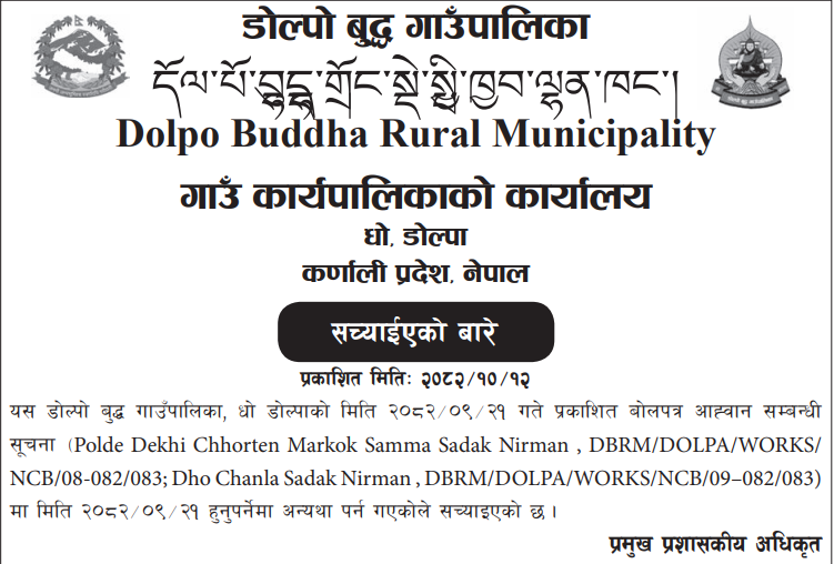 | 77 | Dolpo Buddha Rural Municipality, Dolpa | Tinje Birthing Center Building Construction | 25/01/2026 | PPMO | 24/02/2026 | Click Here | |