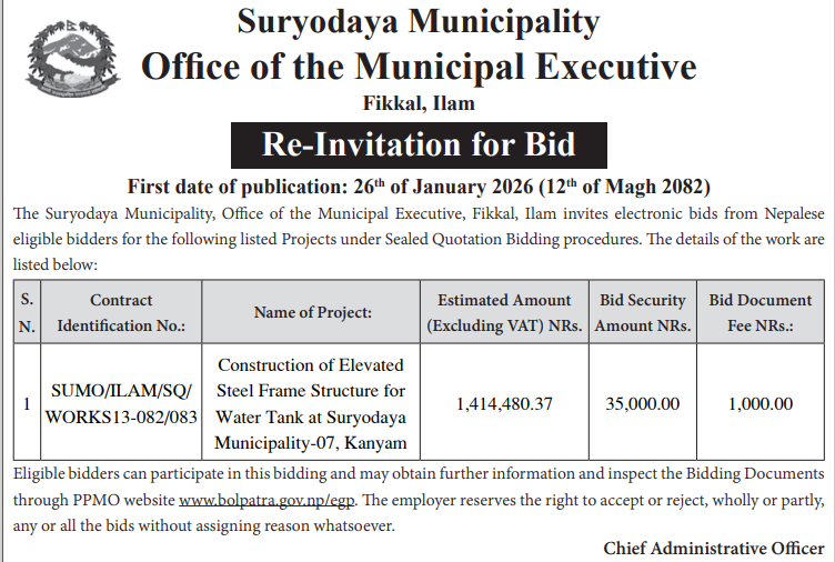 | 31 | Ratuwamai Municipality, Morang | Procurement of Fabricated Steel Parts for Trail Bridges | 25/01/2026 | PPMO | 09/02/2026 | Click Here | |
