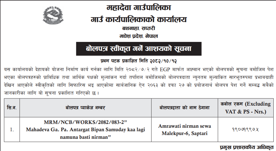 | 154 | Mahottari Rural Municipality Office, Madhesh Province, MAHOTTARI; | Ward no. 3 Mithila Bihari Ko adhuro Nala ra sadak Nirman | 25/01/2026 | PPMO | 09/02/2026 | Click Here | |