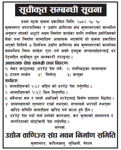 | 141 | Shivraj Municipality, Office of the Municipal Executive, Chandrauta kapilvastu | Madarsha ahale sunnat garibwaj piparako adhuro purwadhar nirman | 25/01/2026 | PPMO | 09/02/2026 | Click Here | |
