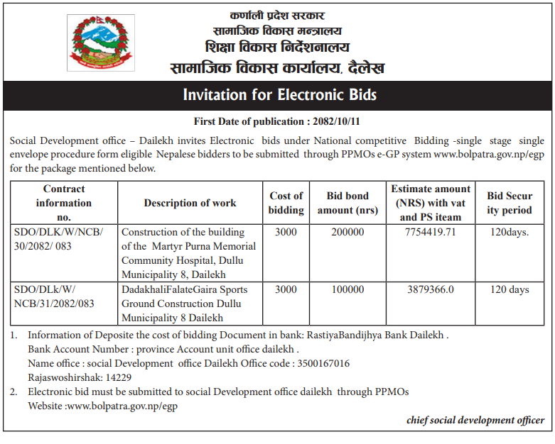 | 123 | Social Development Office, Dailekh | Dadakhali Falate Gaira Sports Ground Construction Dullu Municipality 8 Dailekh | 25/01/2026 | PPMO | 24/02/2026 | Click Here | |