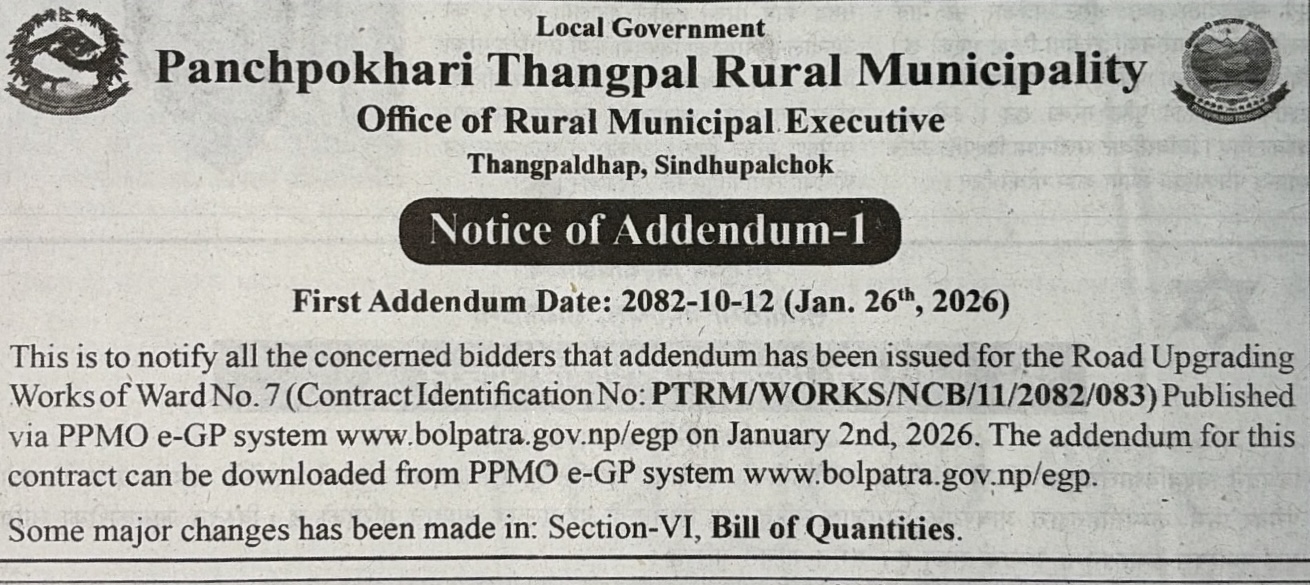 | 85 | Infrastructure Development Office, Rasuwa | Improvement of Roads Under Package-03 {a)Prangse bastala mudulli bhanjyang Sadak starronnati, Kalika-2,Rasuwa b) Gumbadanda Prangse Mudulibhanjyang sadak starunnati,kalika ga.pa.-2, Rasuwa | 25/01/2026 | PPMO | 24/02/2026 | Click Here | |