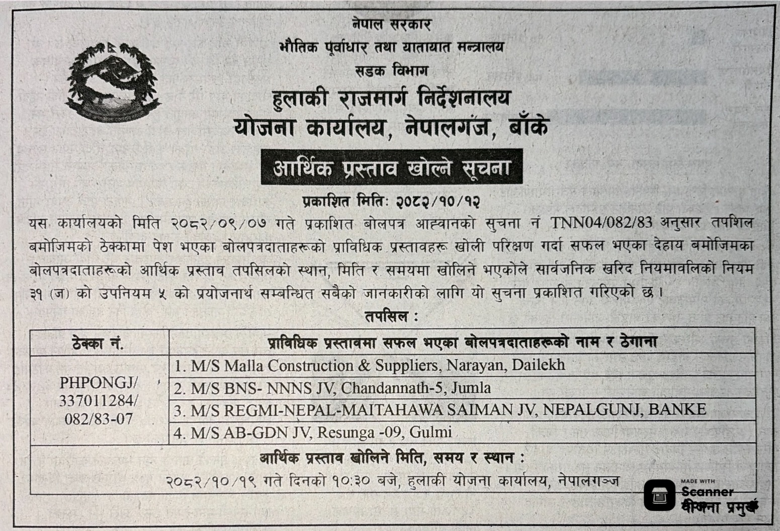 | 96 | Road Division, Chaurjahari | Rehabilitation Works along Rapti Rajmarg (NH-55), Khaulapass-Musikot Section(Ch 136+420 to 140+000 , Ch 154+250 to 168+500) | 25/01/2026 | PPMO | 24/02/2026 | Click Here | |