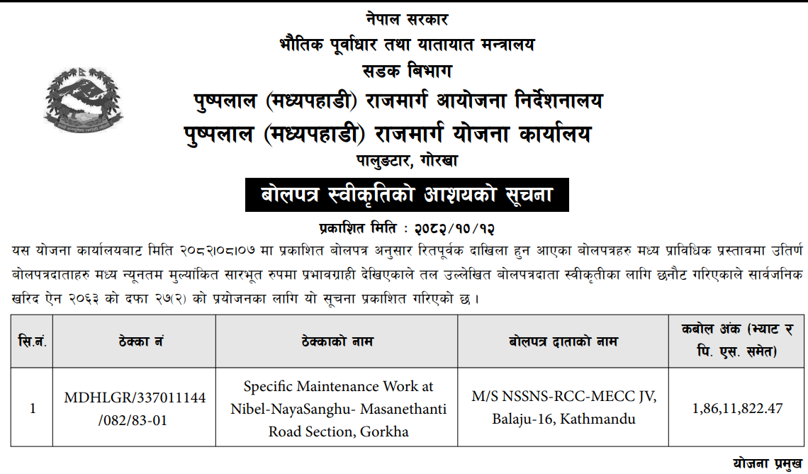 | 4 | Road Division, Baglung | Periodic Maintenance Works (Resealing) along Midhill Highway (Manewapata- Burtibang Ch. 1036+660 to 1064+050) Section | 25/01/2026 | PPMO | 08/02/2026 | Click Here | |