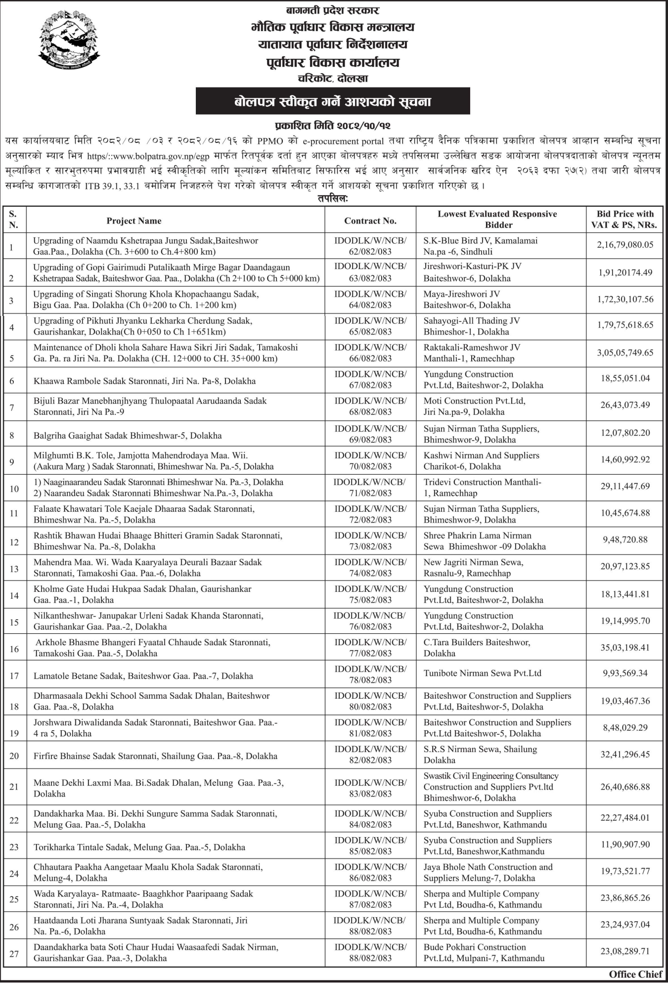 | 81 | Infrastructure development office, Dolakha | Upgrading of Bhrikot Jhule Chhaude Sadak(Baki Khanda), Tamakoshi Ga. Pa. ra Baiteshwor Ga. Pa., Dolakha (Ch.4+250 to Ch. 6+000 km) | 25/01/2026 | PPMO | 24/02/2026 | Click Here | |