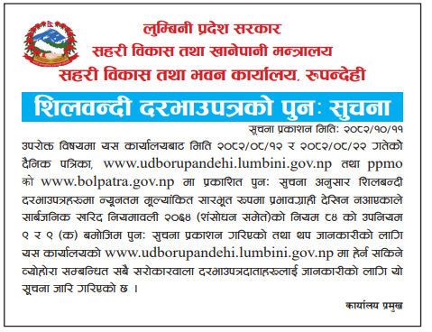 | 11 | Mayadevi Rural Municipality Office, Rupandehi | Consulting Services for Preparation of GIS Based Map with Metric System House Numbering Using Drone, Development of Integrated Data Management system and e-Sifaris System of Mayadevi Rural Municipality | 25/01/2026 | PPMO | 11/03/2026 | Click Here | |