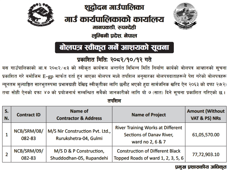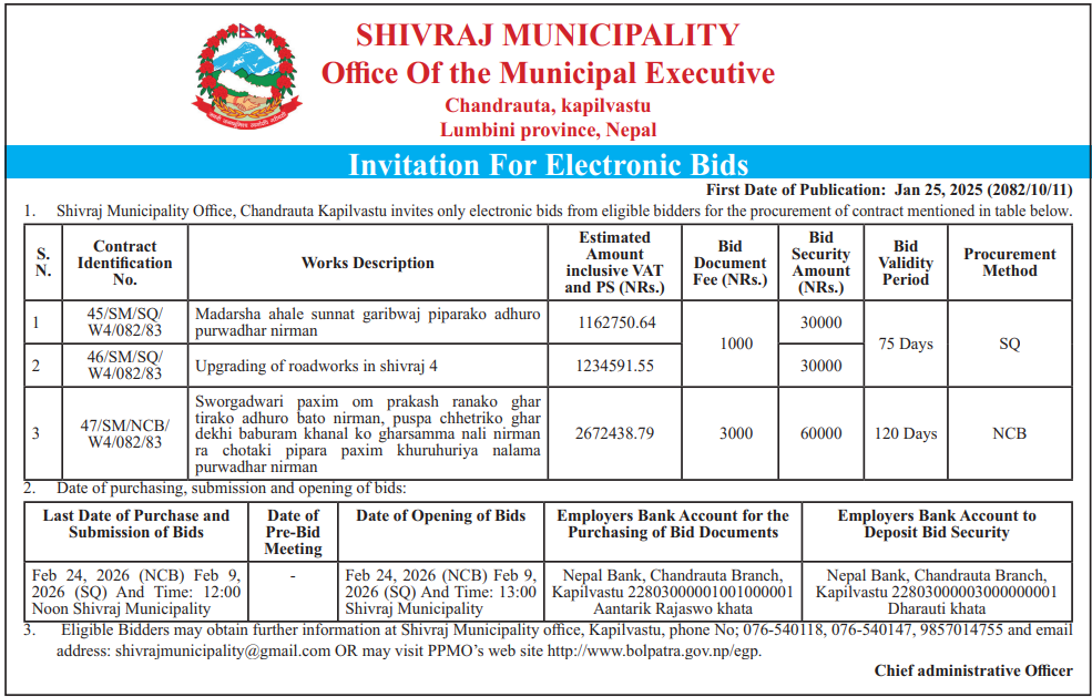 | 142 | Shivraj Municipality, Office of the Municipal Executive, Chandrauta kapilvastu | Upgrading of roadworks in shivraj 4 | 25/01/2026 | PPMO | 09/02/2026 | Click Here | |