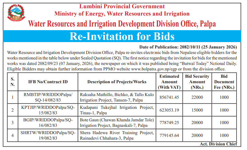 | 143 | Water resource and Irrigation Development Division, Palpa | Construction of Canal and Associated Structures of Bote Gaun (Chawan Khanda Jamdar Tole) Irrigation Project, Bagnaskali Rural Municipality-7, Palpa | 25/01/2026 | PPMO | 09/02/2026 | Click Here | |