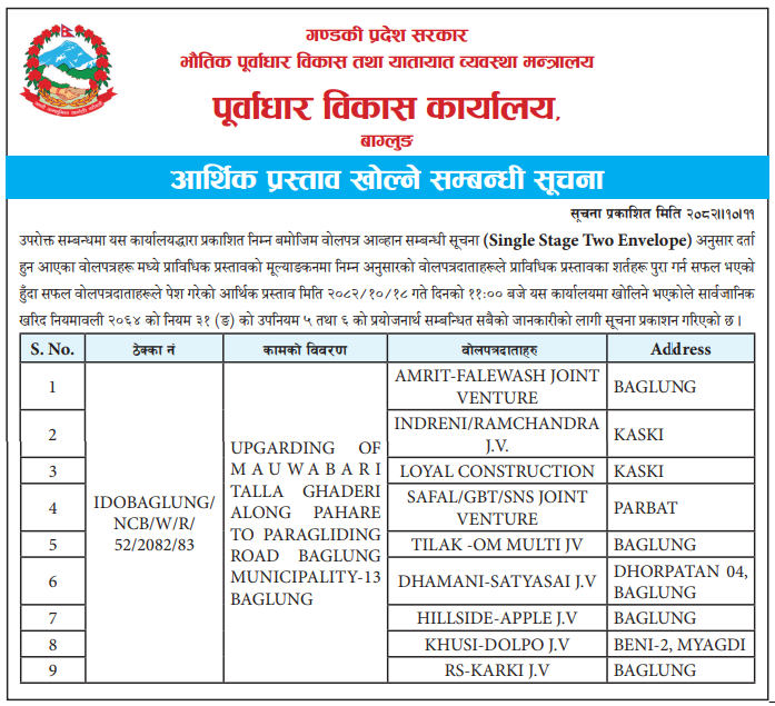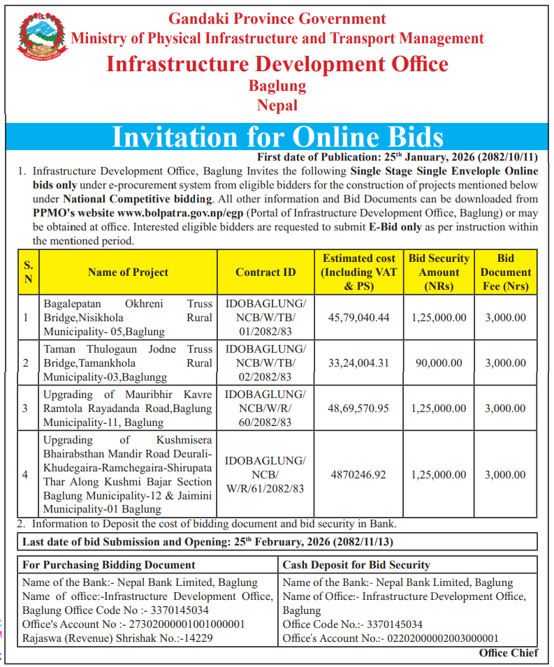 | 117 | Phalebas Municipality Office, Gandaki Province, PARBAT; | Upgrading of Archale–Sarangdi–Piple Road | 25/01/2026 | PPMO | 24/02/2026 | Click Here | |