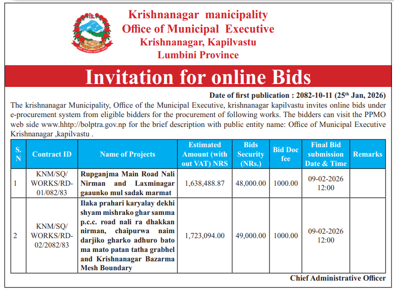 | 148 | Krishnanagar Municipality | Ilaka prahari karyalay dekhi shyam mishrako ghar samma p.c.c. road nali ra dhakkan nirman, chaipurwa naim darjiko gharko adhuro bato ma mato patan tatha grabhel and Krishnanagar Bazarma Mesh Boundary | 25/01/2026 | PPMO | 09/02/2026 | Click Here | |