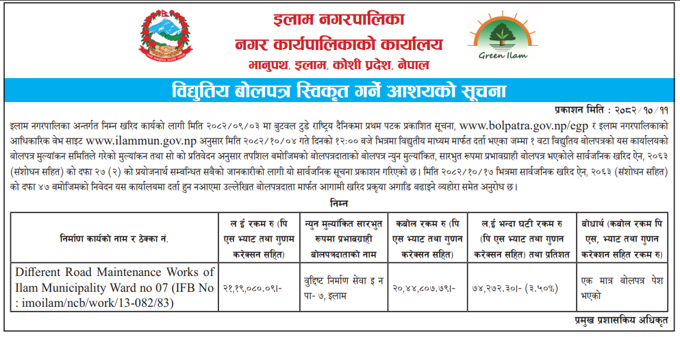 | 106 | Mai Municipality, Danabari, Ilam | Construction of Dahaltar-Hankhim-Suryodaya Na. Pa. 14 Road and Kali Khola Culvert in Mai Municipality 05 | 25/01/2026 | PPMO | 24/02/2026 | Click Here | |