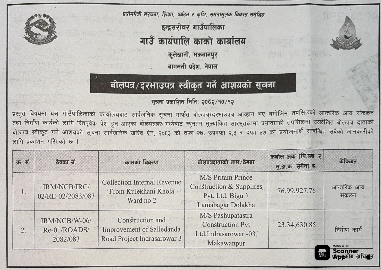 | 6 | Indrasarowar Rural Municipality, Makawanpur | Collection internal Revenue from Kulekhani Khola Ward no 3 | 25/01/2026 | PPMO | 08/02/2026 | Click Here | |