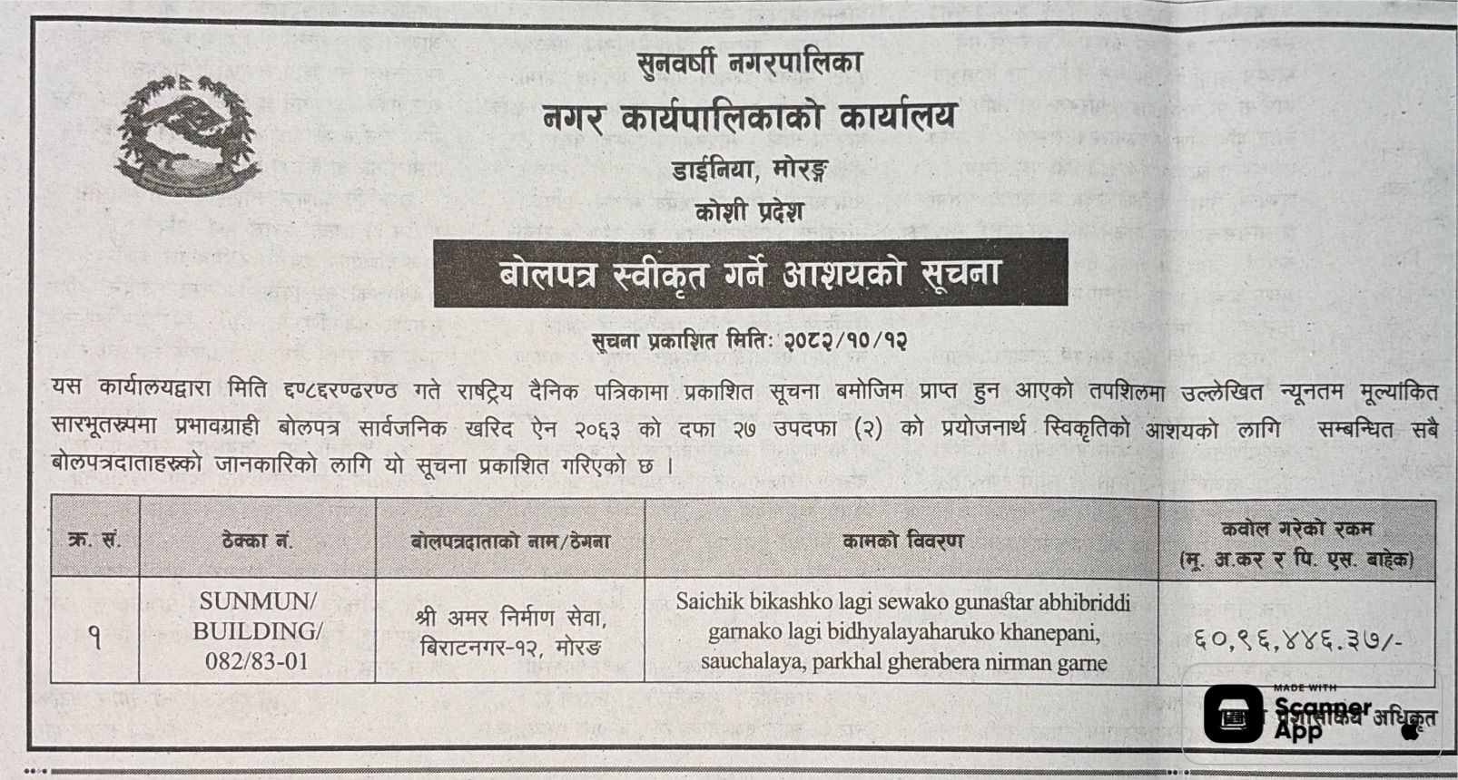 | 71 | Belbari Municipality Office, Koshi Province, MORANG; | Mahendra Madhmik School Building Construction | 25/01/2026 | PPMO | 24/02/2026 | Click Here | |