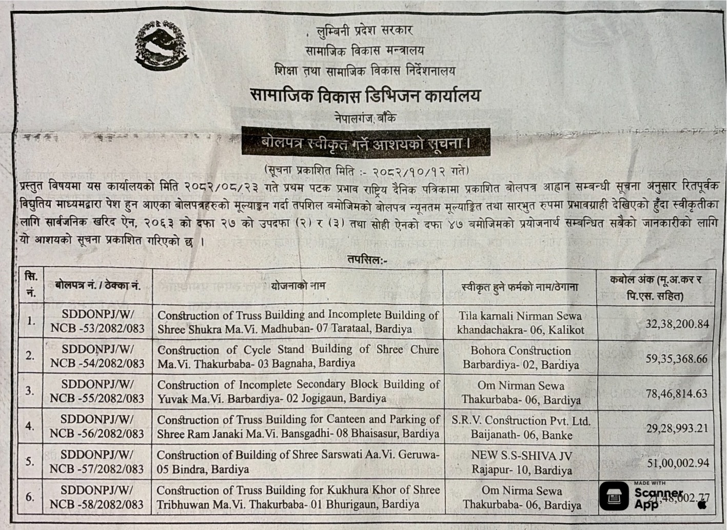 प्रदेश ५ मा प्रकाशित निर्माण सम्बन्धी बोलपत्र तथा आशयका सुचनाहरु