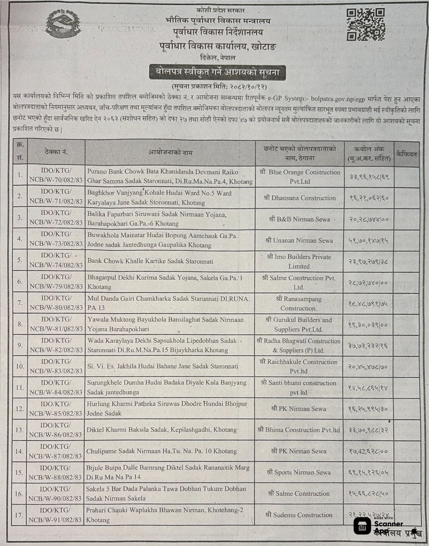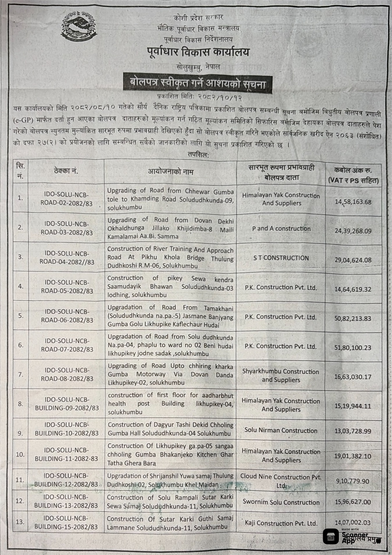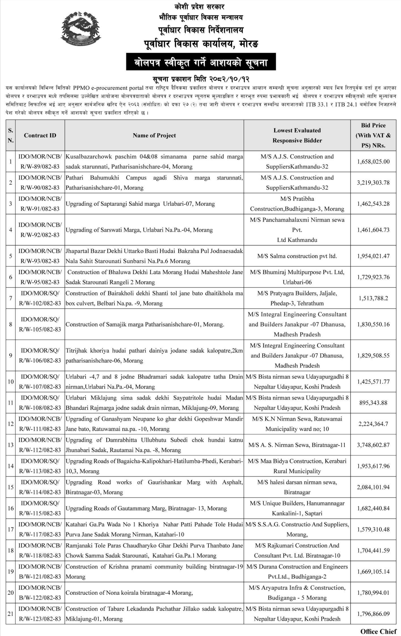 प्रदेश १ मा प्रकाशित निर्माण सम्बन्धी बोलपत्र तथा आशयका सुचनाहरु