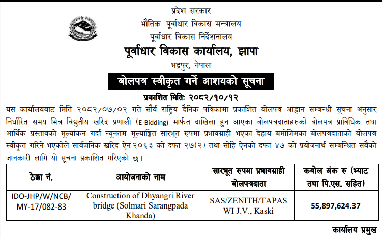 | 8 | Road Division Illam | Emergency Construction of Structural Works for the Installation of Modular Bridge over Jogmai Khola, Construction of Approach Road and Emergency Maintenance of Bajradevi Pul, Ilam along Simalgolai Tilkeni Road | 25/01/2026 | PPMO | 01/02/2026 | Click Here | |