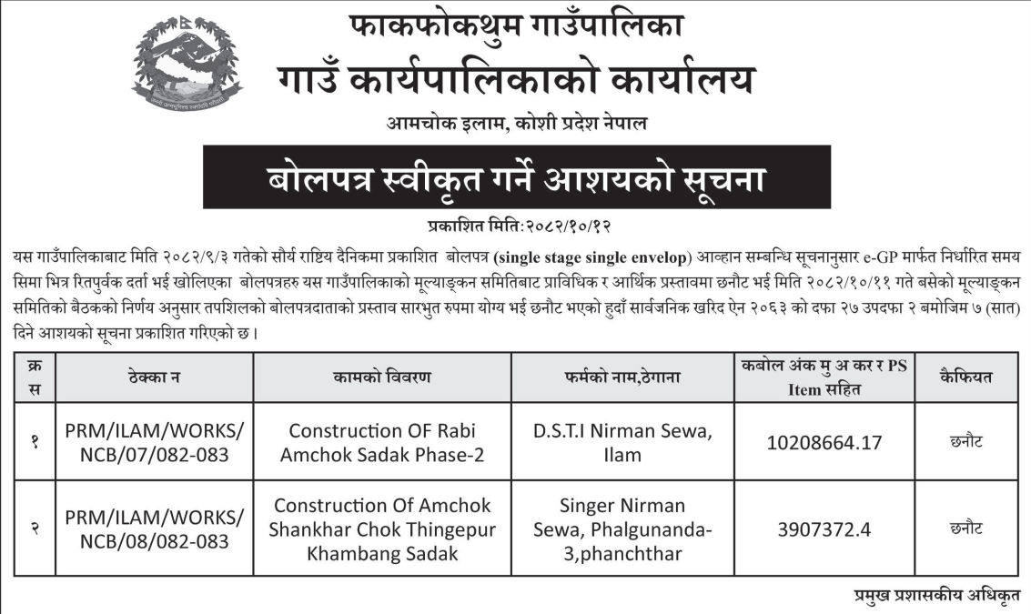 | 118 | Phalebas Municipality Office, Gandaki Province, PARBAT; | Tatopani Rugdi ChaukaPokhara Chuchundeurali Road | 25/01/2026 | PPMO | 24/02/2026 | Click Here | |