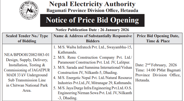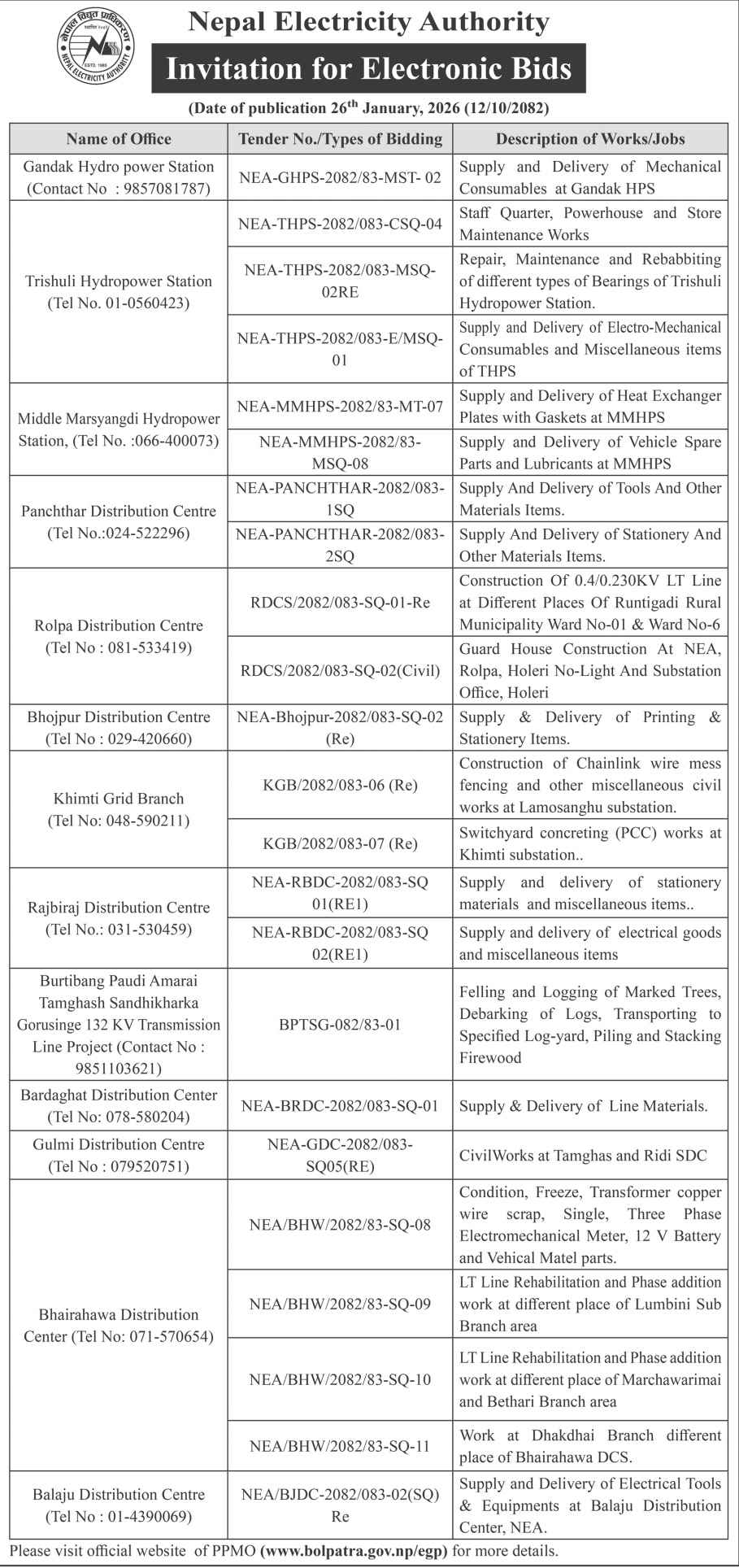 | 28 | NEA, Devighat Hydropower Station | Supply and Delivery of Electrical Consumable Items | 25/01/2026 | PPMO | 09/02/2026 | Click Here | |