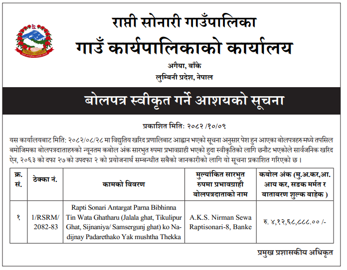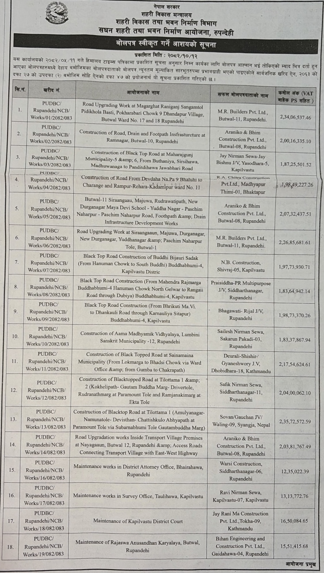 - Award Notice : Road Upgrading Work At Various Places (Swornikita Construction and Suppliers, Gatishil-Gravity JV) |