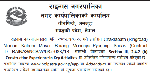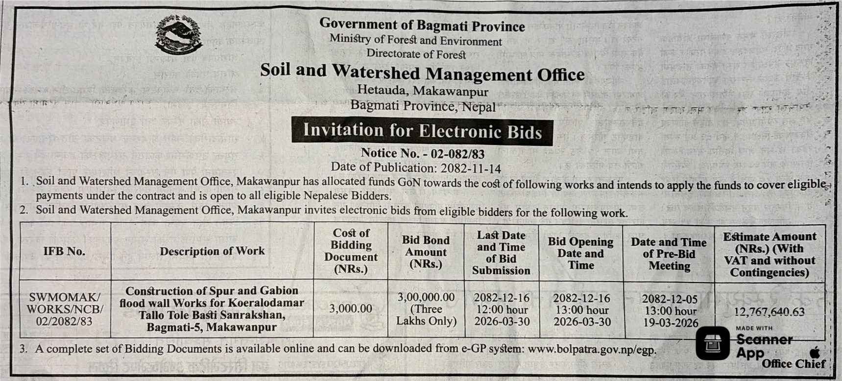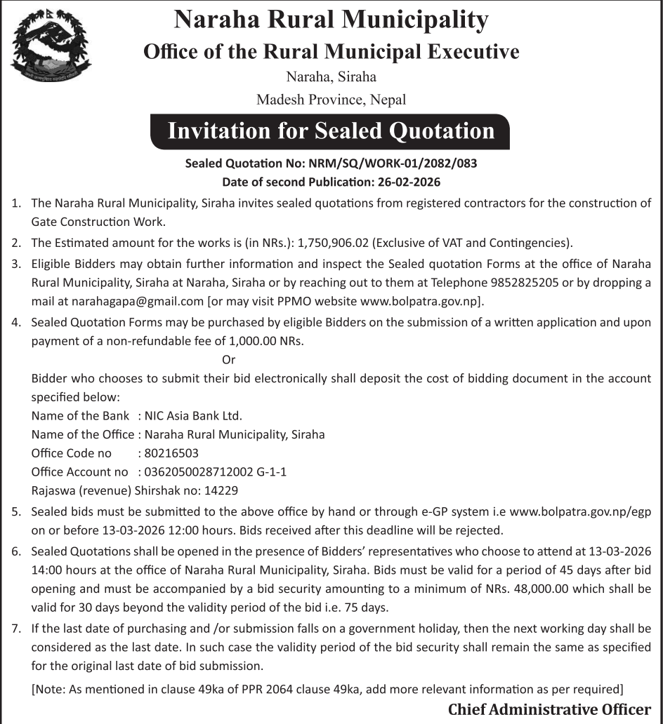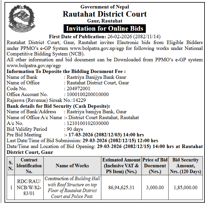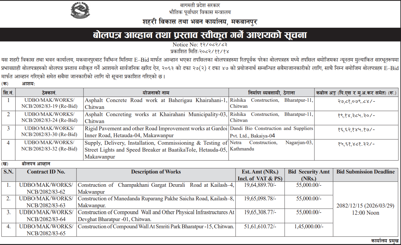 | 82 | Madhyabindu Municipality Office, Gandaki Province, NAWALPARASI EAST; | Bhu.Pu. Gate dekhi Dakshin tarfa sadak Istharunatti, Madhyabindu-12 | 25/02/2026 | PPMO | 29/03/2026 | Click Here | |