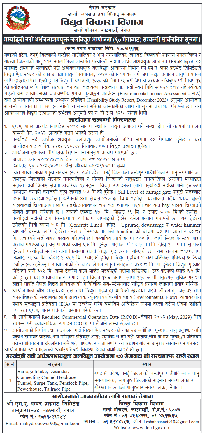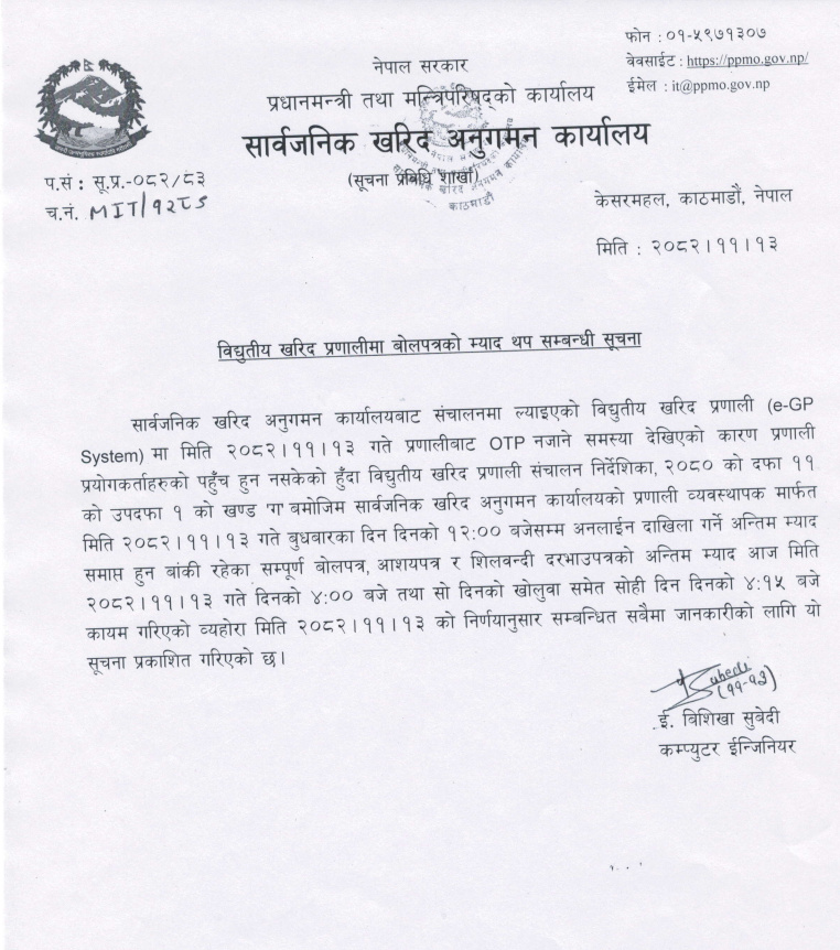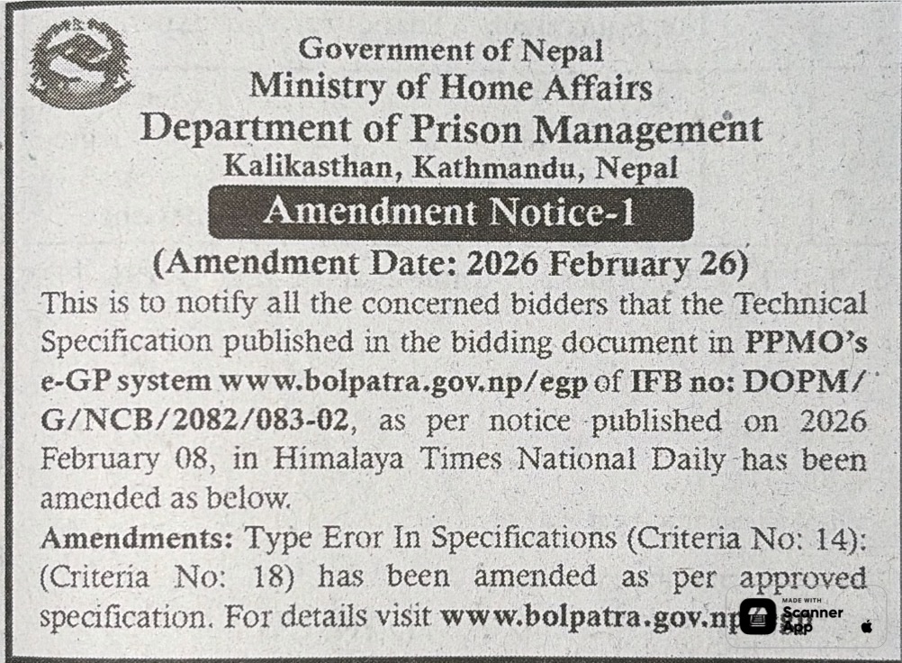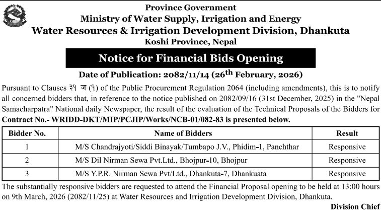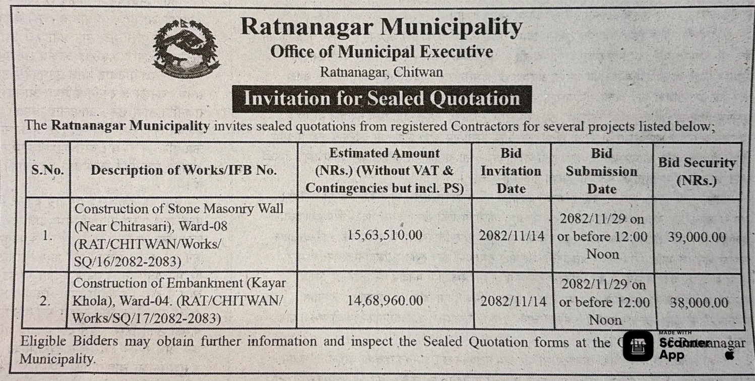 | 82 | Madhyabindu Municipality Office, Gandaki Province, NAWALPARASI EAST; | Bhu.Pu. Gate dekhi Dakshin tarfa sadak Istharunatti, Madhyabindu-12 | 25/02/2026 | PPMO | 29/03/2026 | Click Here | |