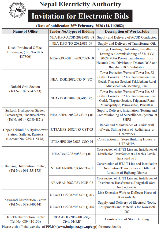 | 7 | NEA, Rangeli Distribution Center | Ht/Lt line construction and transformer installation works. | 25/02/2026 | PPMO | 12/03/2026 | Click Here | |
