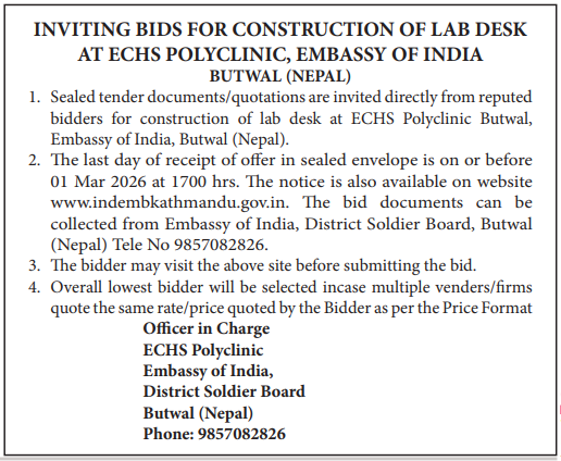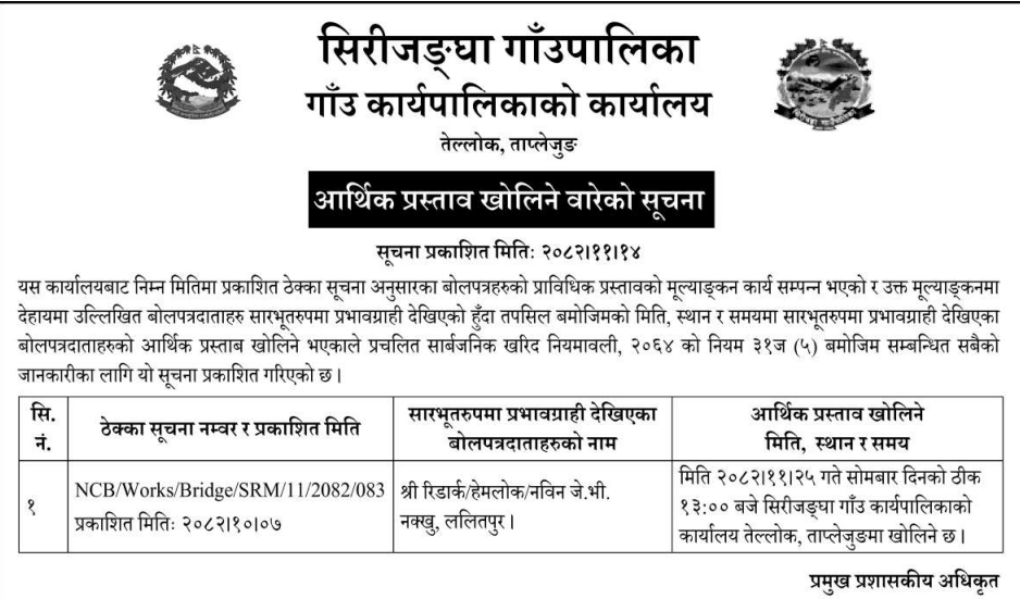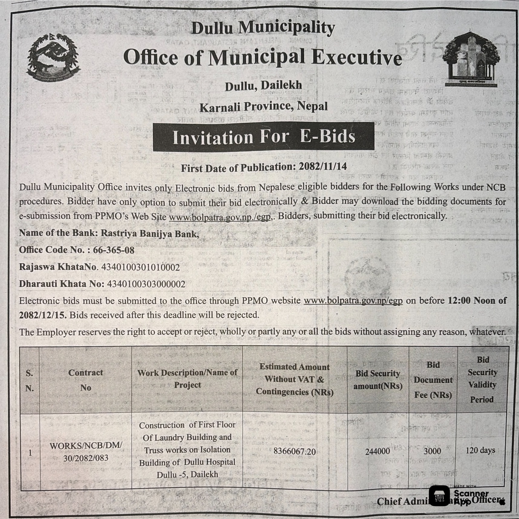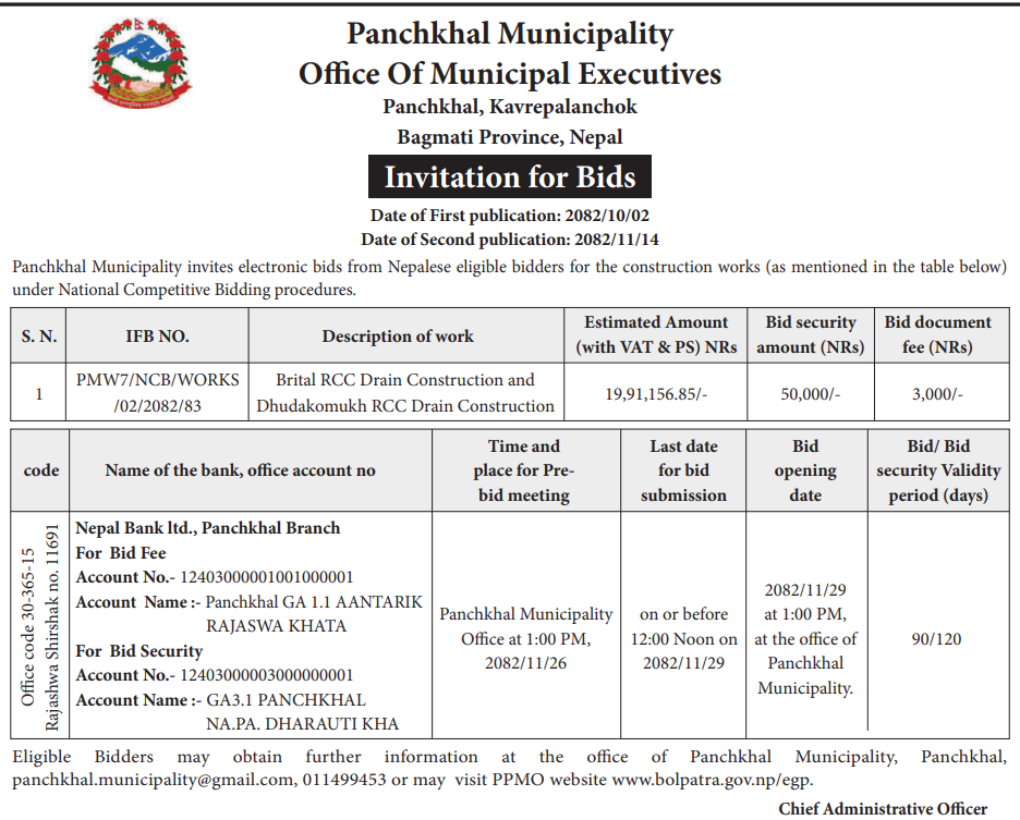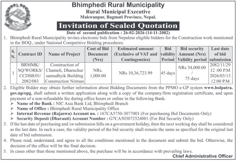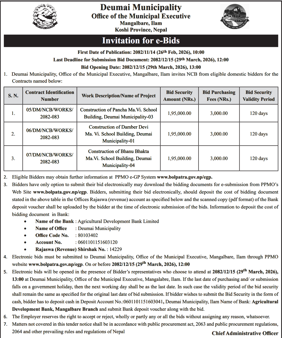 | 4 | Kalinchok Rural Municipality Office, Bagmati Province, DOLAKHA; | Sanskritgram Tutwan Padmarga | 25/02/2026 | PPMO | 12/03/2026 | Click Here | |