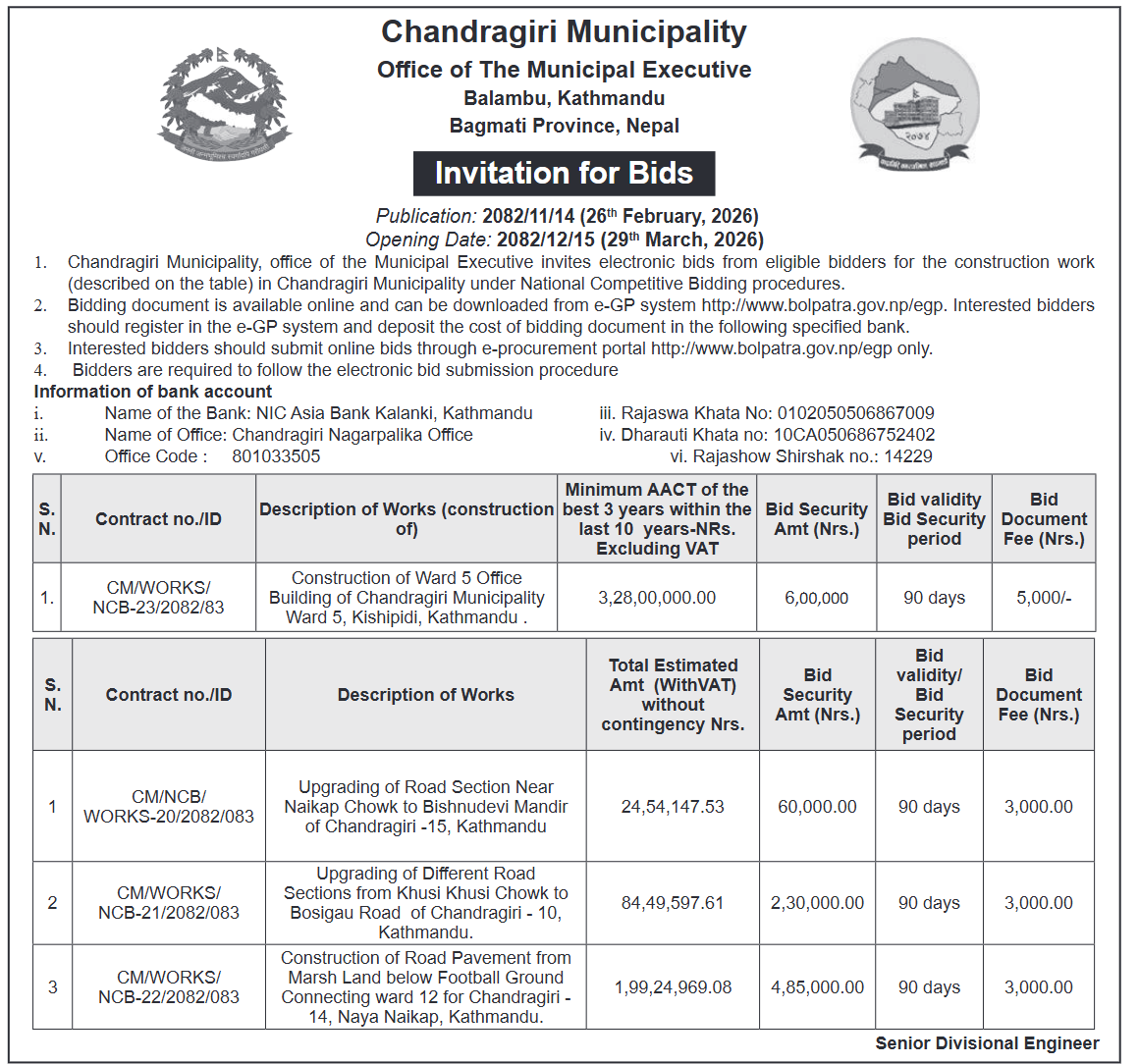 | 92 | Infrastructure Development Office Lalitpur | Upgrading of 1) Simdharama Jane Mulbatobata Shakha Sadakko Dayabaya Wall Nirman, Dhal Nikas Ra Sadak Staronnati 2) Jakha Sangam Chok Dekhi Panga Jane Choksammako Nala Sahit Sadak Dhalan 3) Samacha Dekhi Sanakko Pasal Hundai Dahanko Tallo Bato Sammako Sadak Staronnati, Kirtipur-05, Kathmandu | 25/02/2026 | PPMO | 29/03/2026 | Click Here | |
