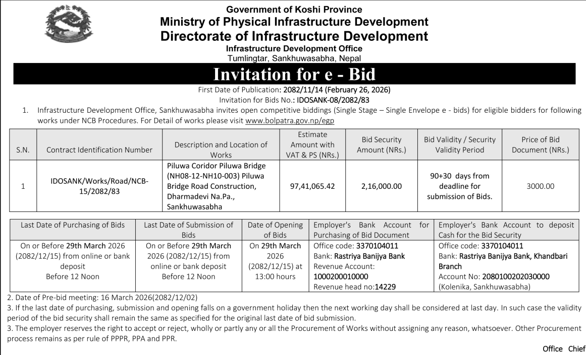 | 120 | Infrastructure Development Office Sindhupalchok | Nandighari Harisidhi Melchaur Sadak Sunkhani Nirman/marmat , Sunkoshi Ga.Pa 5,Sindhupalchok | 25/02/2026 | PPMO | 26/03/2026 | Click Here | |