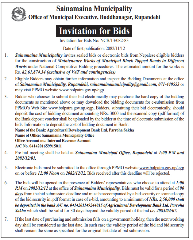 | 6 | Saina Maina Municipality, Rupandehi | Road Infrastructures including Black Topped Works at Ward No. 1 to 11 | 25/02/2026 | PPMO | 12/03/2026 | Click Here | |