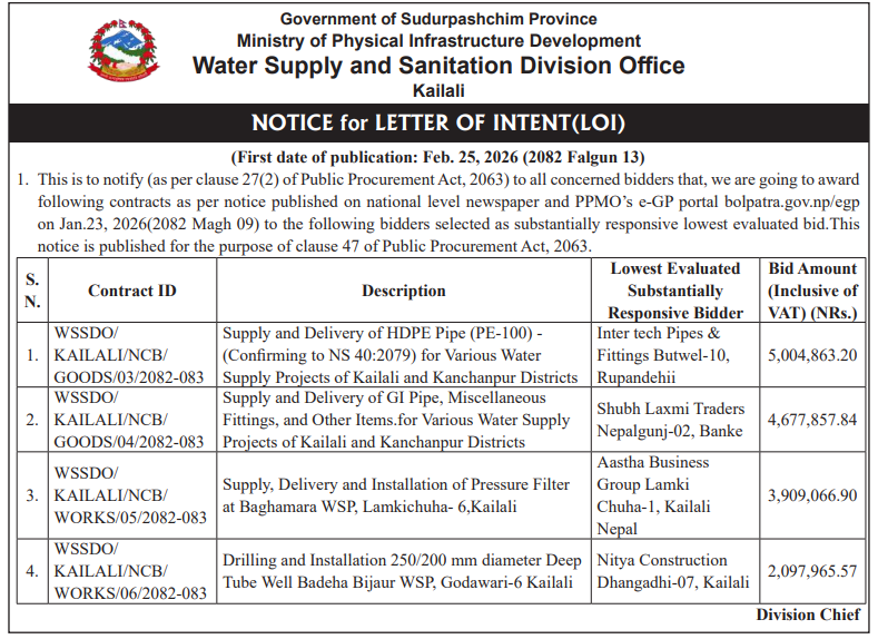 | 22 | Water Supply and Sewerage Management Office, Kanchanpur | Construction of Laljhadi Water Supply Project, Kanchanpur | 25/02/2026 | PPMO | 12/03/2026 | Click Here | |