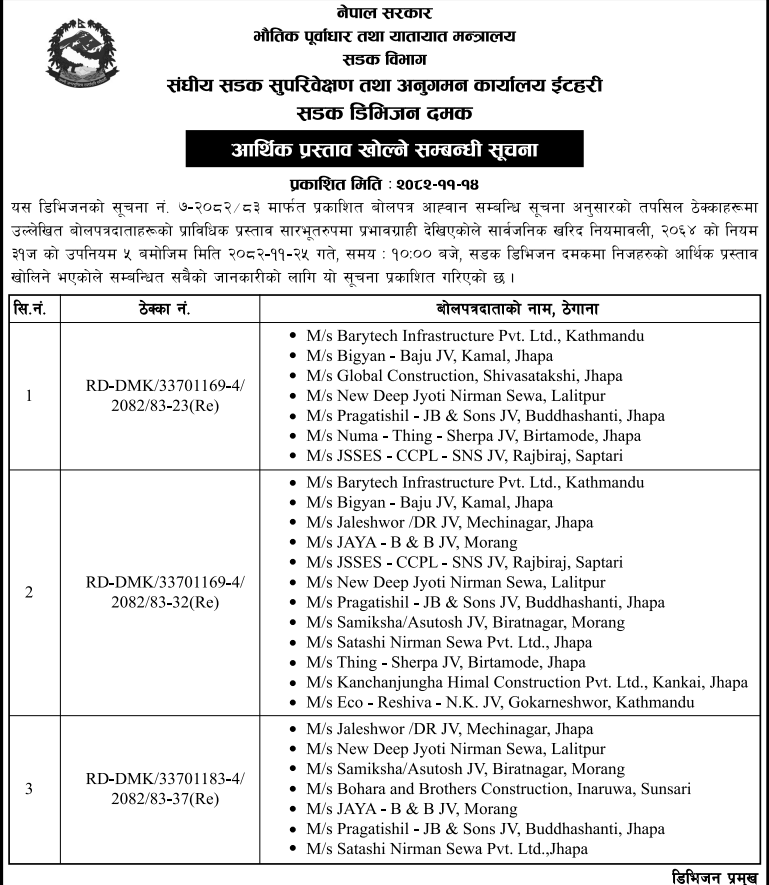 निर्माण सम्बन्धी प्रकाशित सम्पूर्ण ठेक्का टेन्डर तथा बोलपत्र सुचनाहरु प्रदेश अनुसार 26/02/2026 (Thursday)