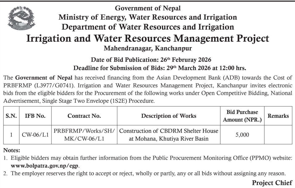 | 87 | Irrigation and Water Resources Management Project, Bharatpur, chitwan | Construction of Shelter House - Chitwan | 25/02/2026 | PPMO | 29/03/2026 | Click Here | |