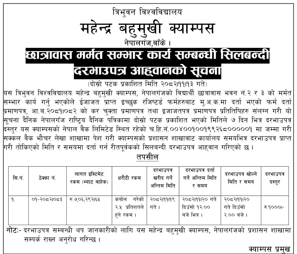 | 28 | Rapti Academy of Health Sciences, Dang | Construction of Doctor's Meeting Hall, Compound Fencing and Partition of Nutrition Block. | 25/02/2026 | PPMO | 03/03/2026 | Click Here | |