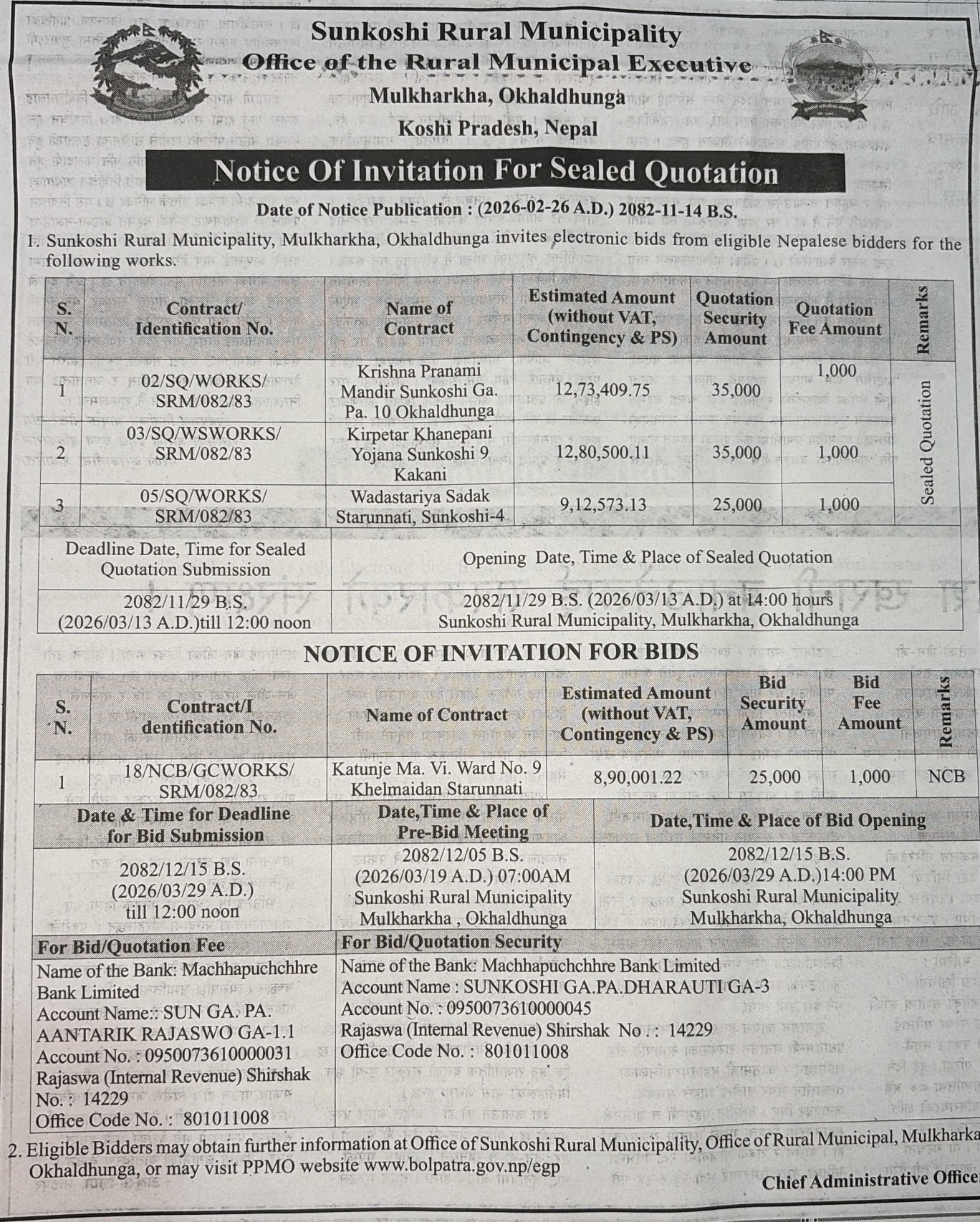 | 20 | Sunkoshi Rural Municipality, Sindhuli | Internal Revenue Collection of Extraction, Collection and Sales of River Bed Materials of Sunkoshi River at Sunkoshi Rural Municipality ward no 5,6 and 7 (Package II) | 25/02/2026 | PPMO | 12/03/2026 | Click Here | |
