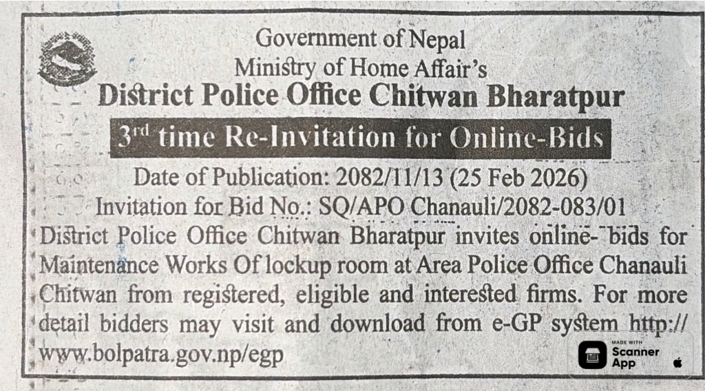 | 27 | District Police Office, Chitwan | Maintenance Works Of lockup room at Area Police Office Chanauli Chitwan | 25/02/2026 | PPMO | 04/03/2026 | Click Here | |