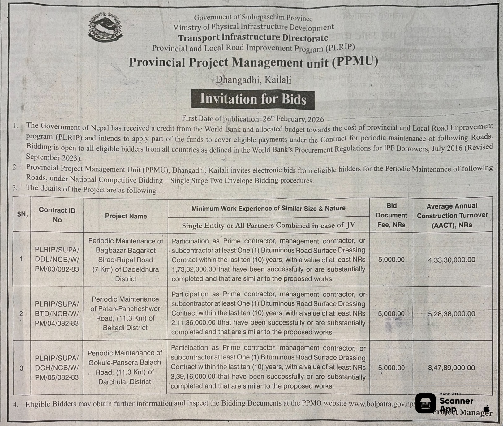 | 80 | Madhyabindu Municipality Office, Gandaki Province, NAWALPARASI EAST; | Sahid Hari Marga Magarshinga sangam chowk ramilo tol bato istharunatti, Madhyabindu-13 | 25/02/2026 | PPMO | 29/03/2026 | Click Here | |