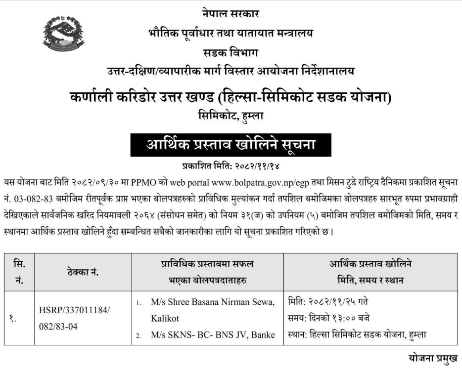 | 5 | Mahabu Rural Municipality Office, Karnali Province, DAILEKH; | Gorti kadeni road construction Mahabu R.M ward no 5 | 25/02/2026 | PPMO | 12/03/2026 | Click Here | |