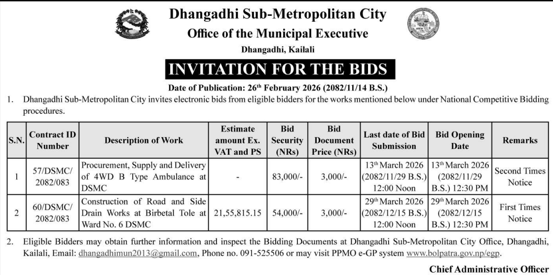 | 151 | Dhangadhi Sub-Metropolitan City | Road Maintenance Works (Phirangi Bhagat’s House to Prem Rana’s House) at Ward No. 07 DSMC | 25/02/2026 | PPMO | 12/03/2026 | Click Here | |