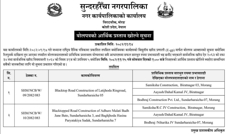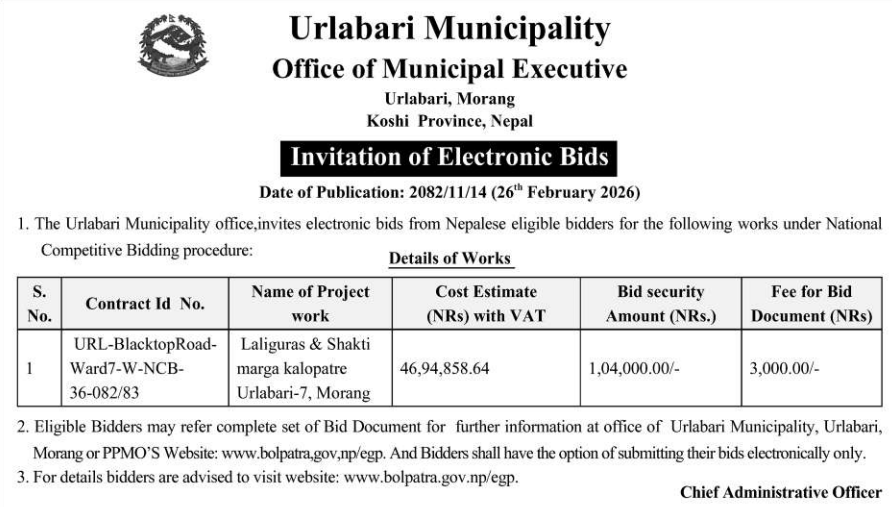 | 106 | Urlabari Municipality | Banijya Sangh Tole Sadak Nirman Urlabari-5,Morang | 25/02/2026 | PPMO | 29/03/2026 | Click Here | |