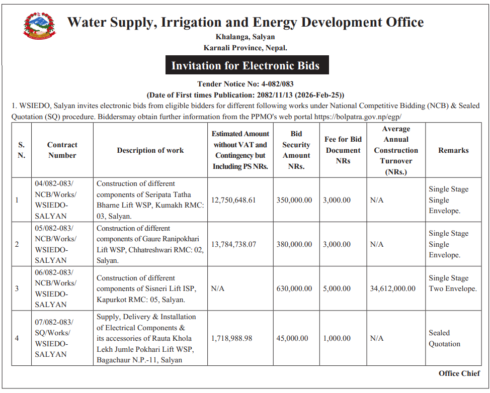 | 77 | Water Supply Irrigation and Energy Development Office, Salyan | Construction of 8"/6" dia. x 200 m Deep Tubewell and Pumping Test Works at Kaphalswara, Sunkoshi RM-03, Sindhupalchok | 25/02/2026 | PPMO | 29/03/2026 | Click Here | |