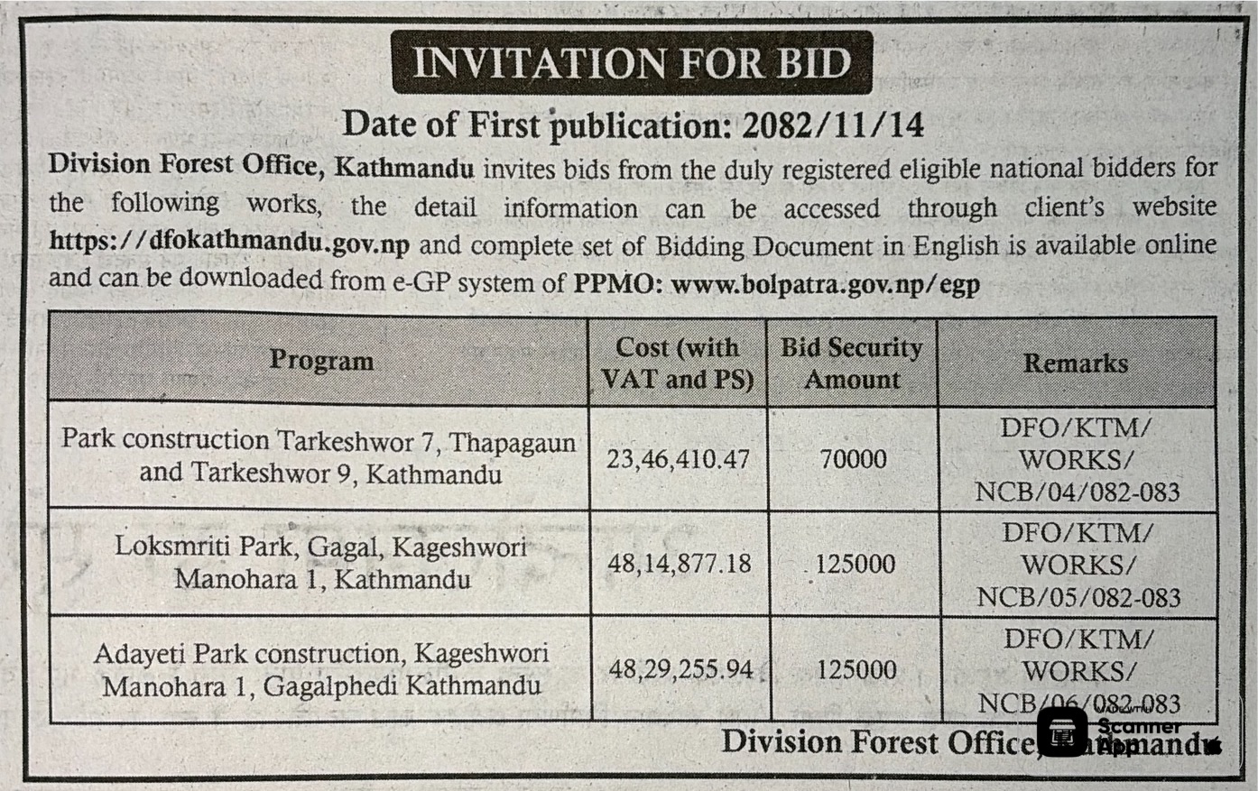 | 109 | Division Forest Office, Kathmandu | Park Nirman Tarkeshwor 9 and Tarkeshwor 7 | 25/02/2026 | PPMO | 27/03/2026 | Click Here | |