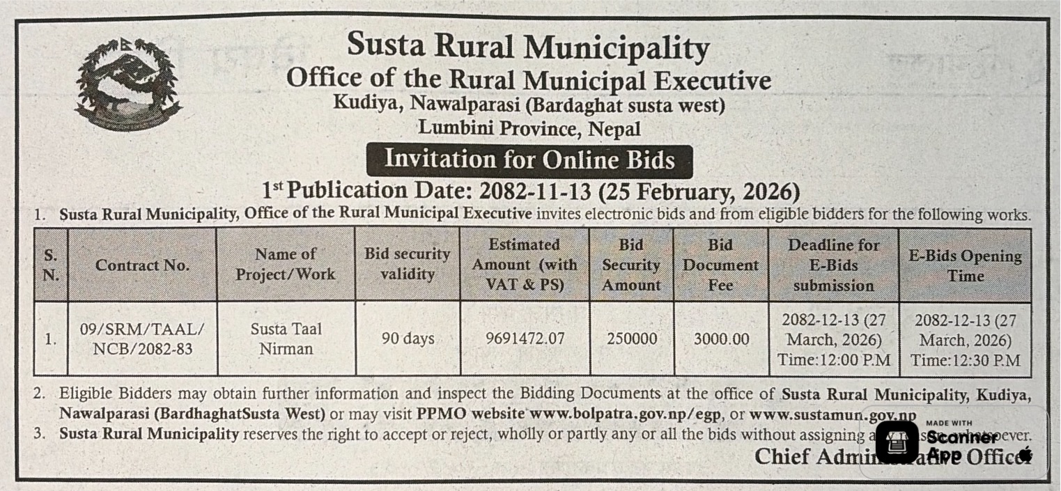 | 107 | Susta Rural Municipality | Susta Taal Nirman | 25/02/2026 | PPMO | 27/03/2026 | Click Here | |