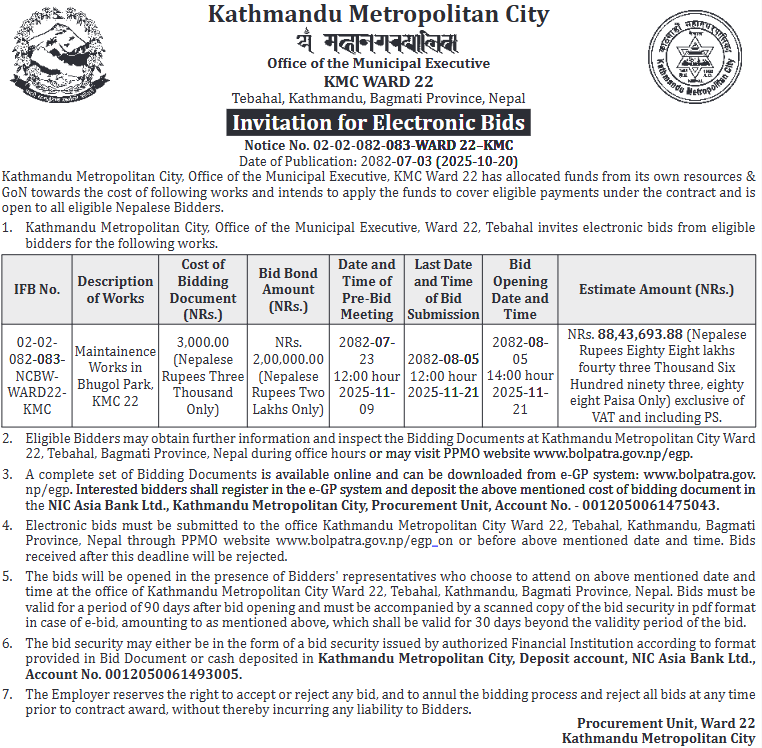 | 8 | KMC Ward 22 | Maintainence Works in Bhugol Park,KMC-22 | 20/10/2025 | Ppmo | 21/11/2025 | Click Here | |
