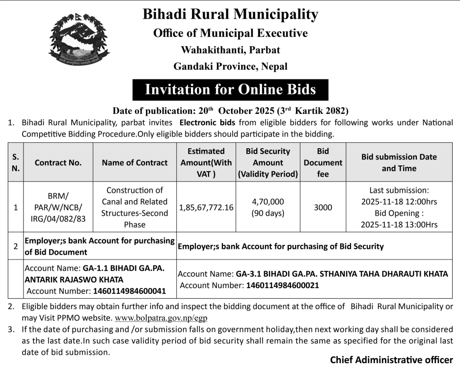 | 35 | Bihadi Rural Municipality,Parbat | Construction of Canal and Related structures-Second Phase | 20/10/2025 | Ppmo | 18/11/2025 | Click Here | |
