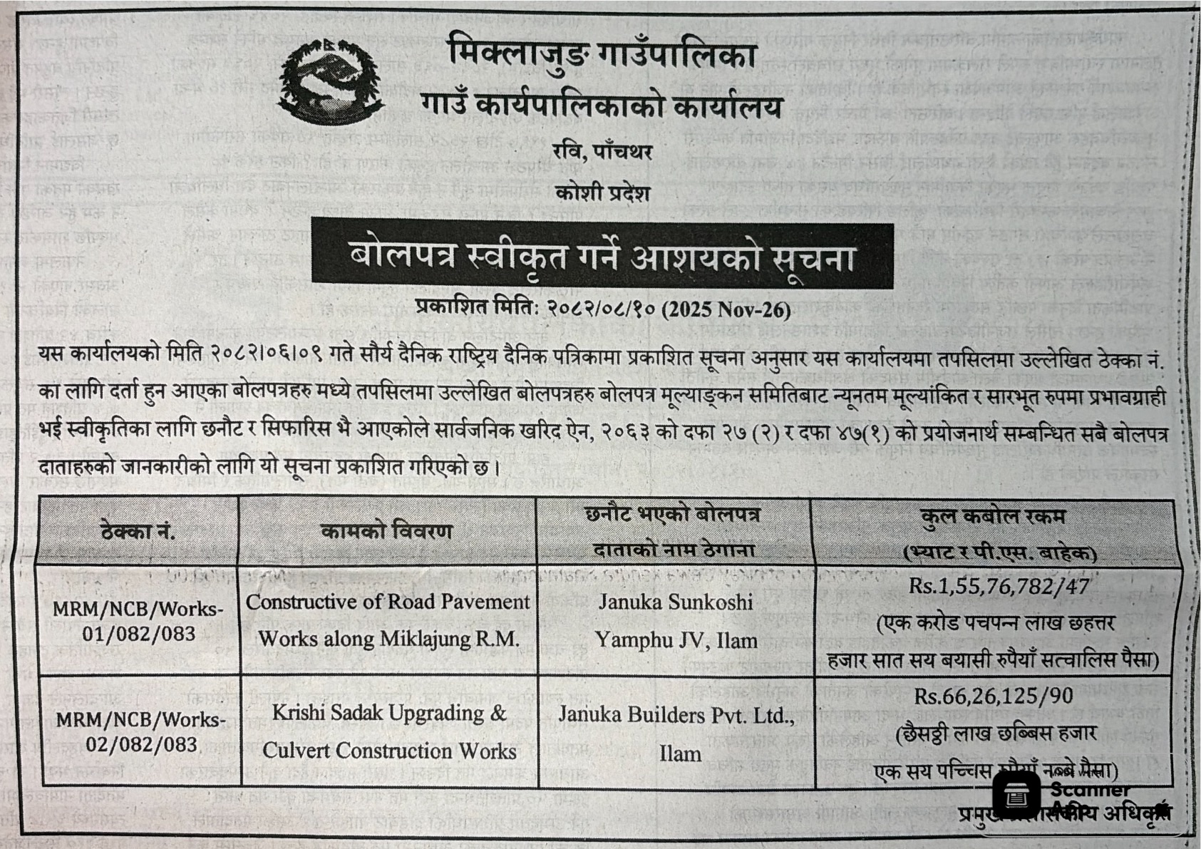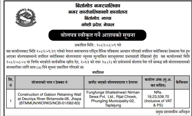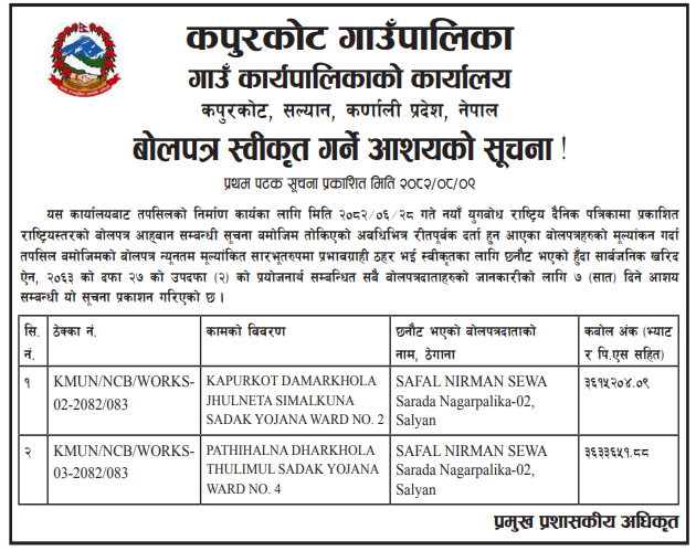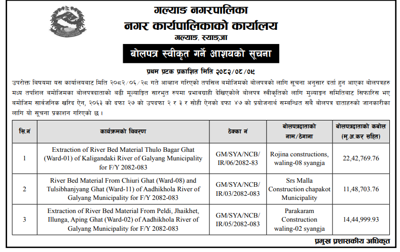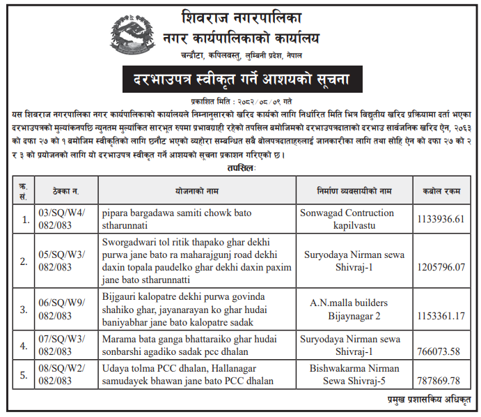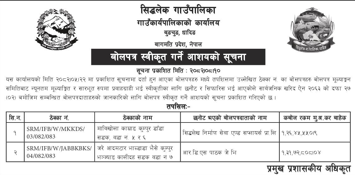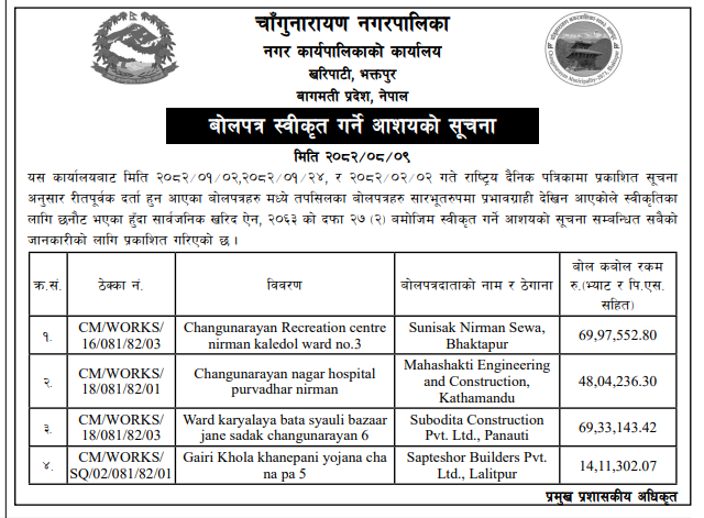 बोलपत्र स्विकृत ; Bid Award (Construction only) 26/11/2025 (Wednesday)