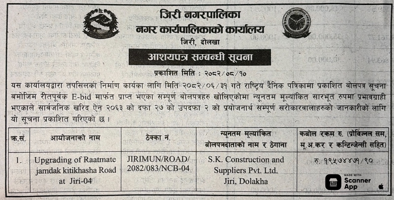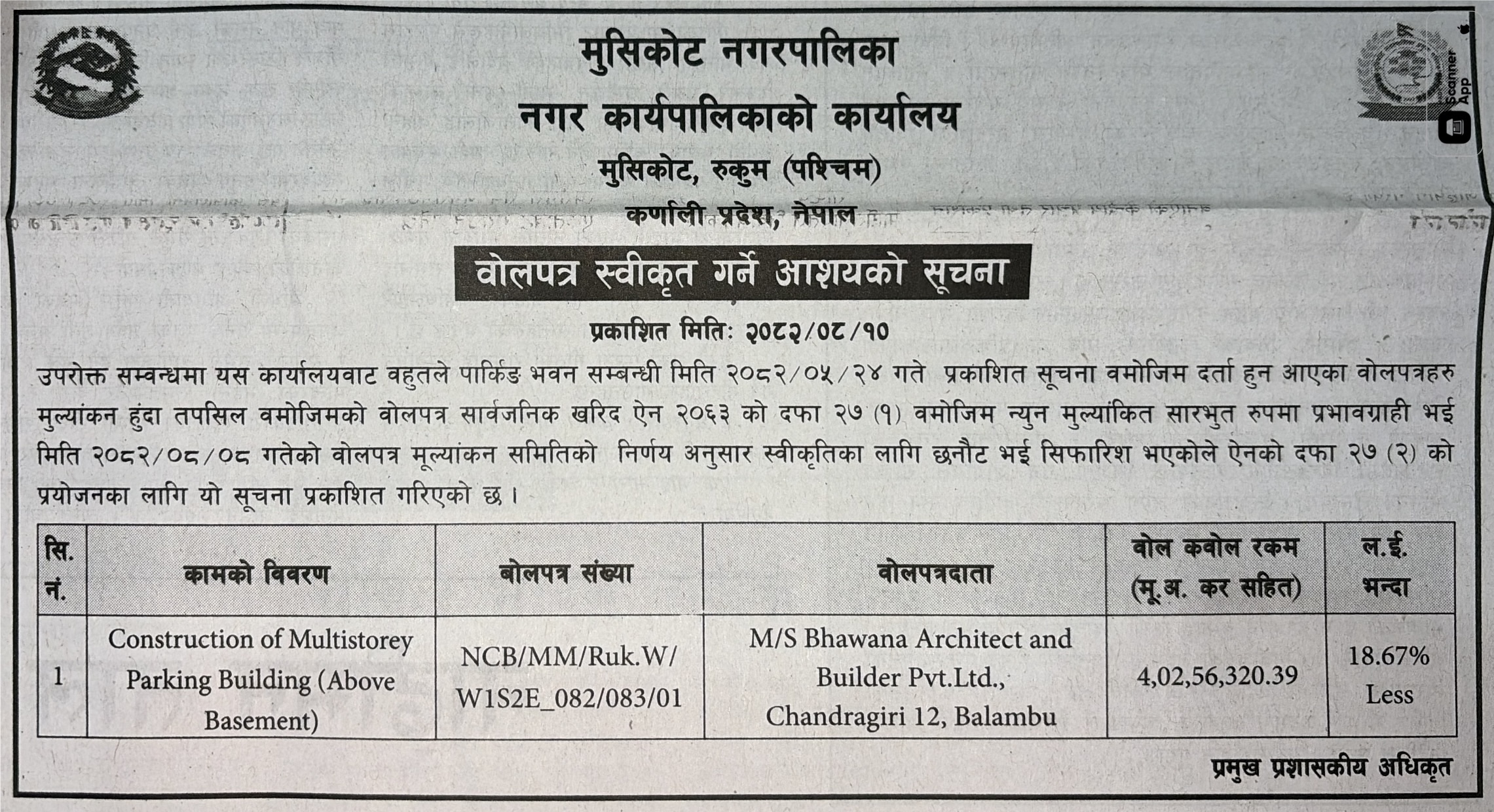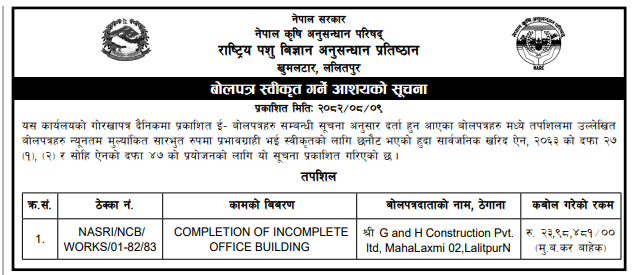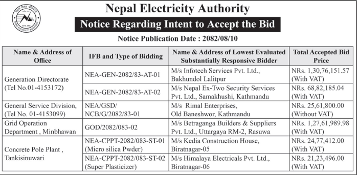 बोलपत्र स्विकृत ; Bid Award (Construction only) 26/11/2025 (Wednesday)