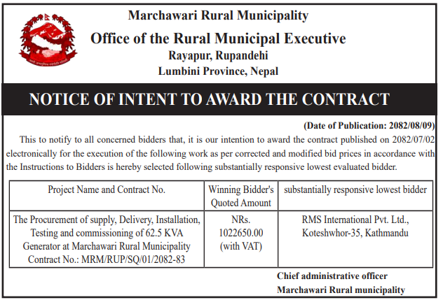 | 4 | Marchawari Rural Municipality, Rupandehi | Sonbarsa, Maharajgang, Patilaha, Musarahawa, Madhubaniya Samma Kalopatre, Ward 1,3 | 25/11/2025 | PPMO | 26/12/2025 | Click Here | |